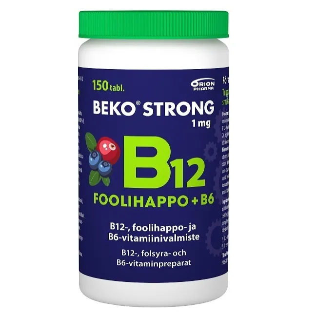 Beko Strong B12 + foolihappo + B6 - жевательная таблетка с витамином В12, фолиевой кислотой и витамином В6. Подходит для пожилых людей, вегетарианцев и веганов. Витамины В12, В6 и фолиевая кислота способствуют нормальному функционированию иммунной системы, уменьшают симптомы усталости.