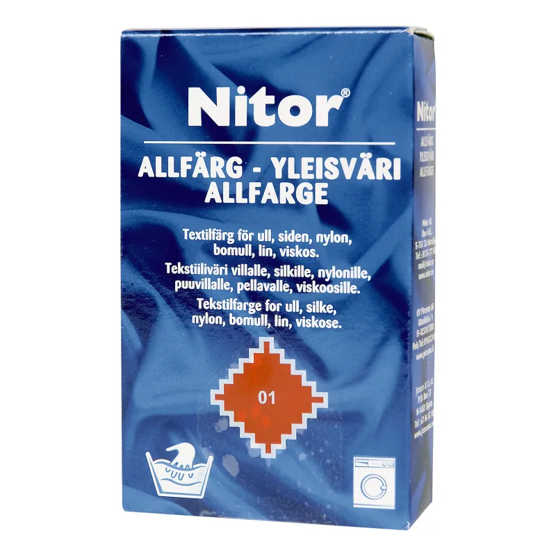 Nitor Универсальная краска 01 Красный подходит для окрашивания даже деликатных тканей. Вы можете использовать её для шерсти, шелка, нейлона, хлопка, льна и вискозы. Окрашивание можно проводить вручную или в стиральной машине, однако для особо деликатных материалов рекомендуется ручное окрашивание. Nitor универсальная краска — это так называемая защитная краска, поэтому особенно хороша для тканей, которые редко стираются. Для более стойкого окрашивания используйте с солью для текстильной краски Nitor!