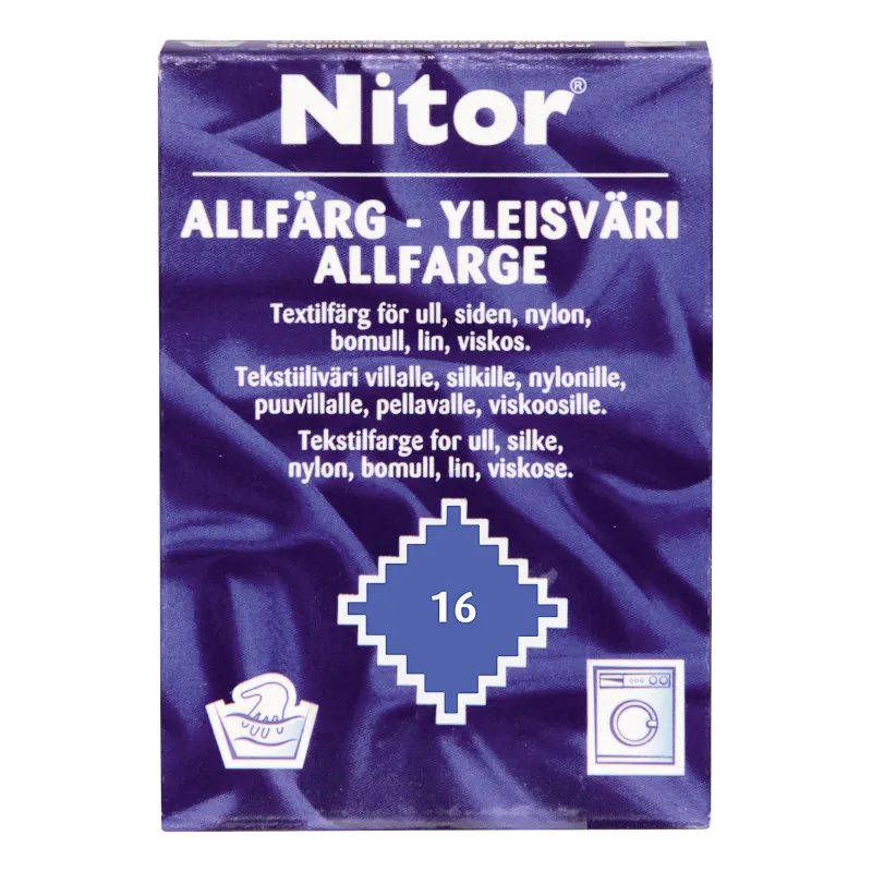 Один пакетик Nitor универсальной краски окрашивает около 200 г текстиля. В одной упаковке содержится один пакетик порошковой краски.