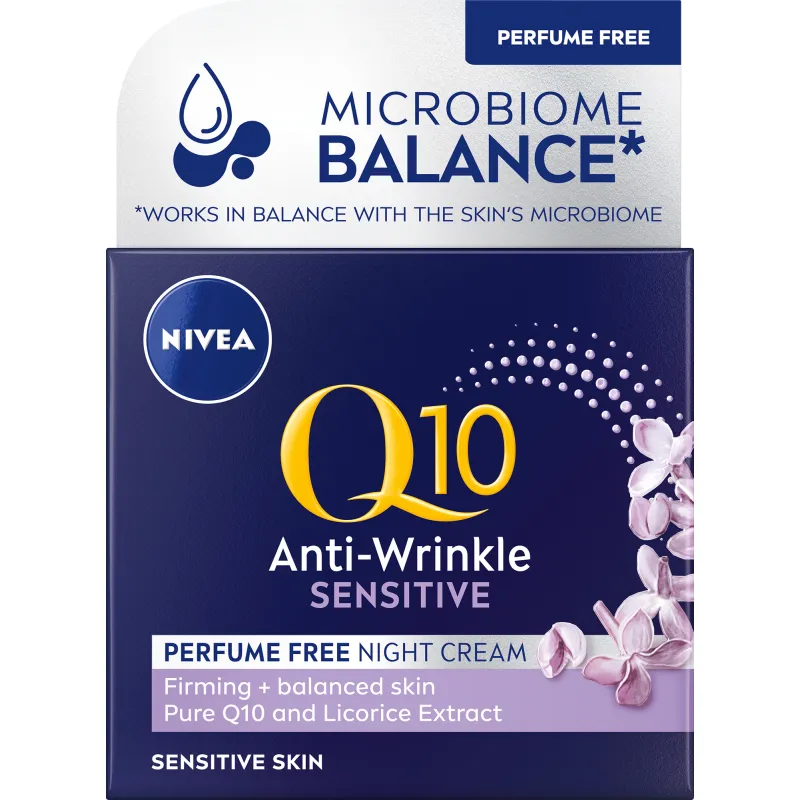 Nivea Q10 Power Anti-Wrinkle + для чувствительной кожи – это ночной крем с запатентованной формулой, которая эффективно борется с мелкими морщинами и складками. Особо разработан для чувствительной кожи, крем не содержит отдушек и включает в себя успокаивающий экстракт корня лакрицы. Крем эффективно уменьшает сухость, стянутость и покраснение кожи, делая её более упругой и красивой. Благодаря своей уходовой формуле, крем обновляет кожу в течение ночи, когда она наиболее восприимчива к увлажнению. Объем упаковки: 50 мл.