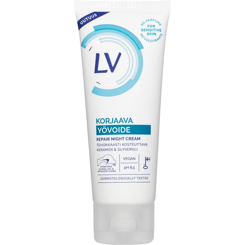Ночной крем LV эффективно увлажняет кожу в течение ночи. Содержит защитные и восстанавливающие керамиды, которые способствуют улучшению состояния кожи. Крем можно использовать как маску для лица: нанесите крем на лицо, оставьте на 10 минут и удалите излишки. Без отдушек и красителей. Разработан в сотрудничестве с Ассоциацией аллергии и астмы. Изготовлено в Финляндии. Объем упаковки 60 мл. Мы постоянно обновляем информацию о продукте, но рекомендуем всегда проверять данные на упаковке.