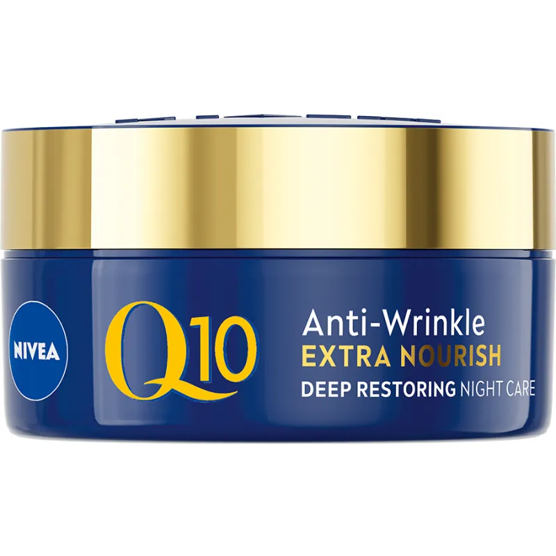 Nivea Q10 Anti-Wrinkle Extra Nourish Deep Restoring - ночной крем, который помогает восстанавливать кожу в течение ночи, делая её мягкой и эластичной. Разработан для очень сухой кожи и кожи в период менопаузы. Состав включает чистый коэнзим Q10, который заряжает энергией клетки кожи. Органическое масло арганы активно увлажняет кожу, а сквалан укрепляет и предотвращает сухость. Дерматологически протестировано. Объем упаковки 50 мл.
