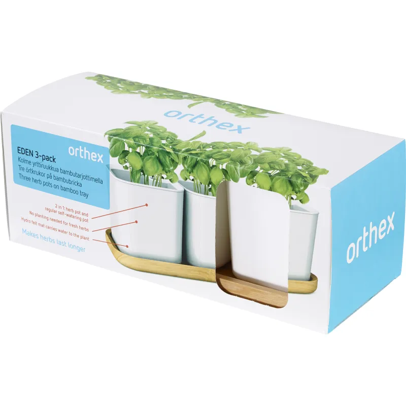 Горшки для трав Orthex Eden помогут вашим травам чувствовать себя комфортно и оставаться свежими дольше. Они оснащены системой автополива и специальным моховым ковриком. Посадка не требуется – просто поместите траву в оригинальном пластиковом горшке прямо в горшок Eden. Вместительный водный резервуар увеличивает промежуток между поливами. Объем водного резервуара составляет 0,3 литра, а объем земли – 0,8 литра. В комплект входят три горшка для трав и стильный бамбуковый поднос.
