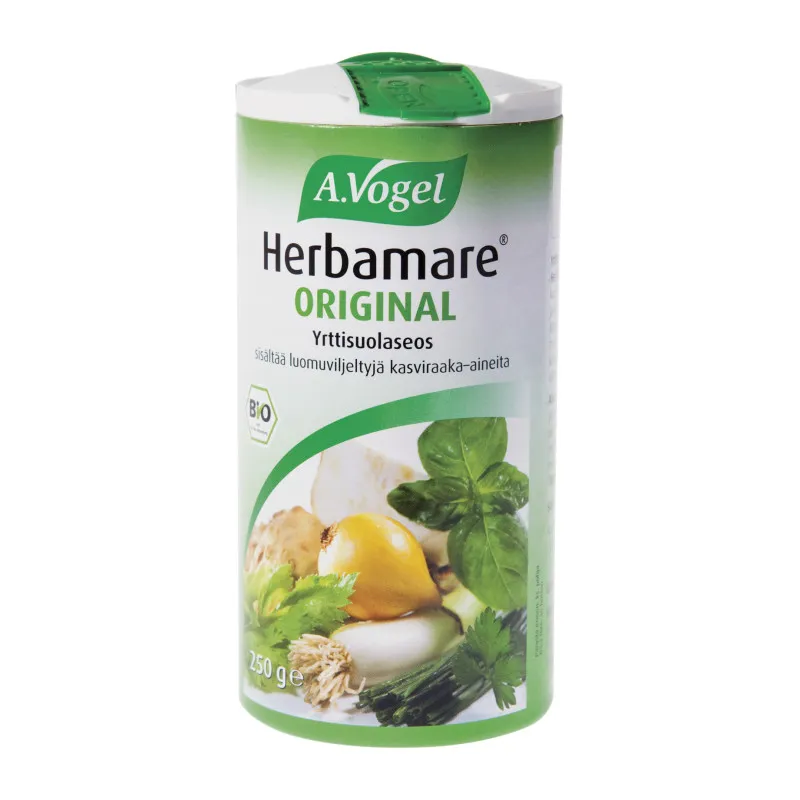 Herbamare приобретает свой уникальный вкус благодаря тому, что растения соединяются свежесобранными с морской солью и бережно высушиваются методом, сохраняющим ароматы. В Herbamare также содержится морская водоросль с натуральным йодом. Herbamare не содержит глутамата натрия или других добавок. Свежий и насыщенный вкус раскрывается наилучшим образом, когда Herbamare добавляется в готовые блюда, которые не нужно больше готовить. Попробуйте травяную соль вместо обычной, например, с молодым картофелем или вареным яйцом! Herbamare легко посыпать на еду из удобной упаковки, и вам не понадобятся другие специи. Используя травяную соль вместо обычной, вы можете незаметно снизить потребление соли.