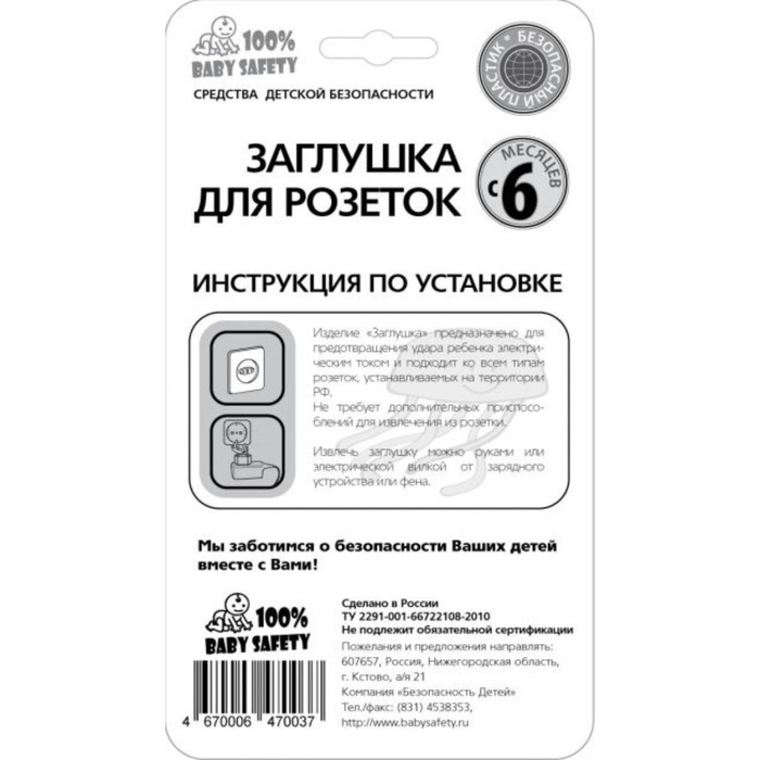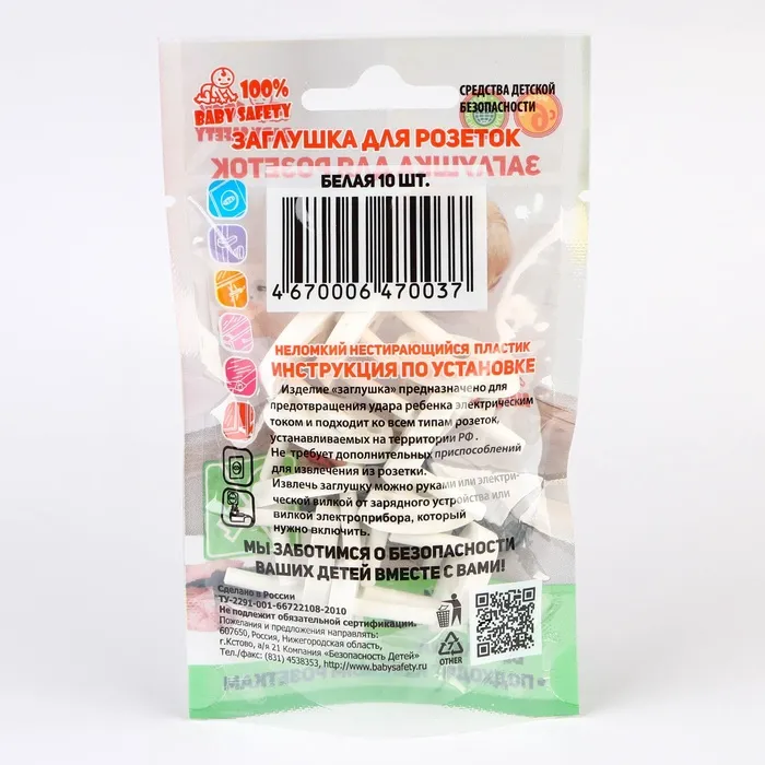 Заглушка для розетки, цвет белый, набор 10 шт, Baby Safety — Характеристики