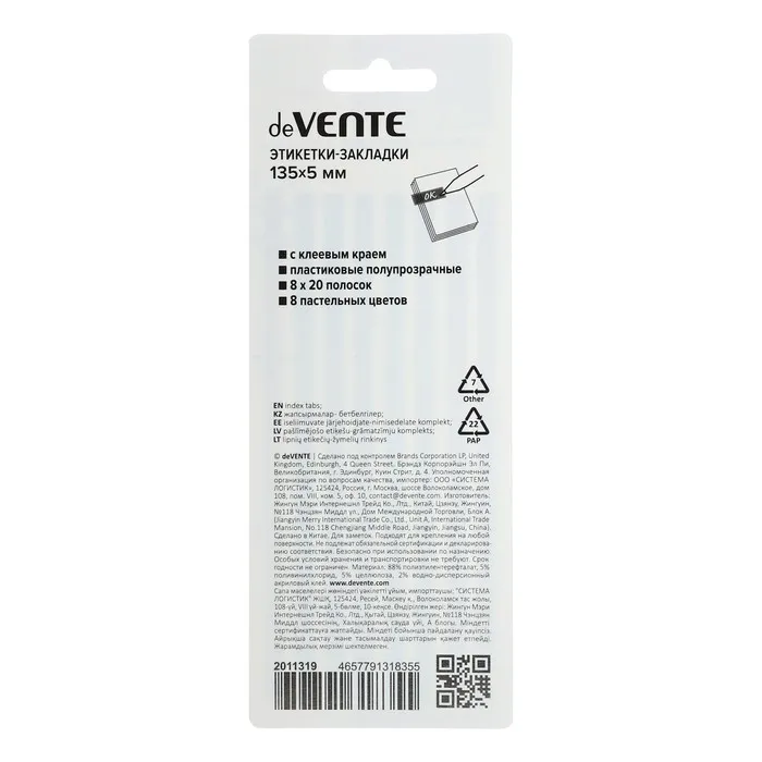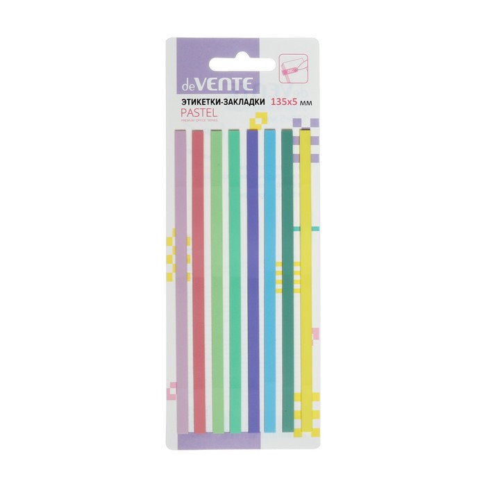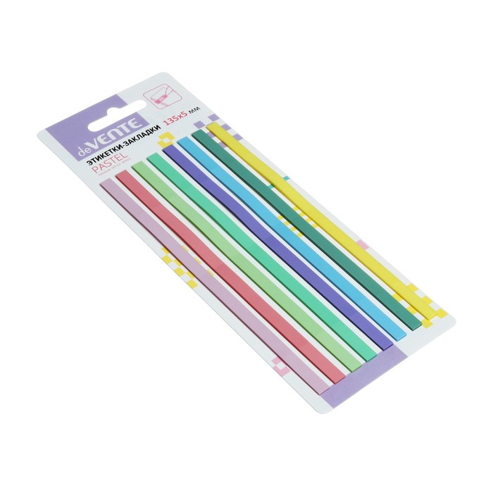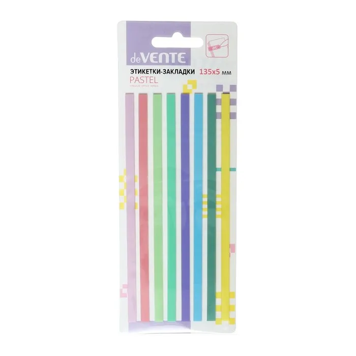 Закладки с клеевым краем, 5 х 135 мм, 8 цветов по 20 листов, пластиковые, deVENTE Pastel, блистер — Характеристики