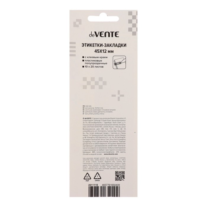 Набор самоклеящихся этикеток-закладок "deVENTE. Pastel" пластиковые полупрозрачные 45 x 12 мм, 10 x 20 листов, 10 пастельных цветов, в картонном блистере и пластиковом пакете с европодвесом