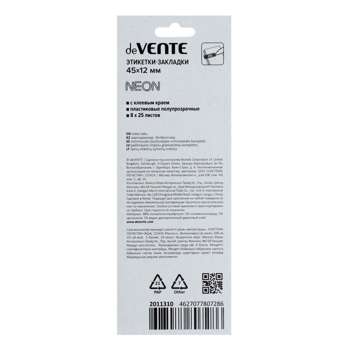 Набор самоклеящихся этикеток-закладок "deVENTE" пластиковые полупрозрачные 45 x 12 мм, 8 x 25 листов, 8 неоновых цветов, в картонном блистере