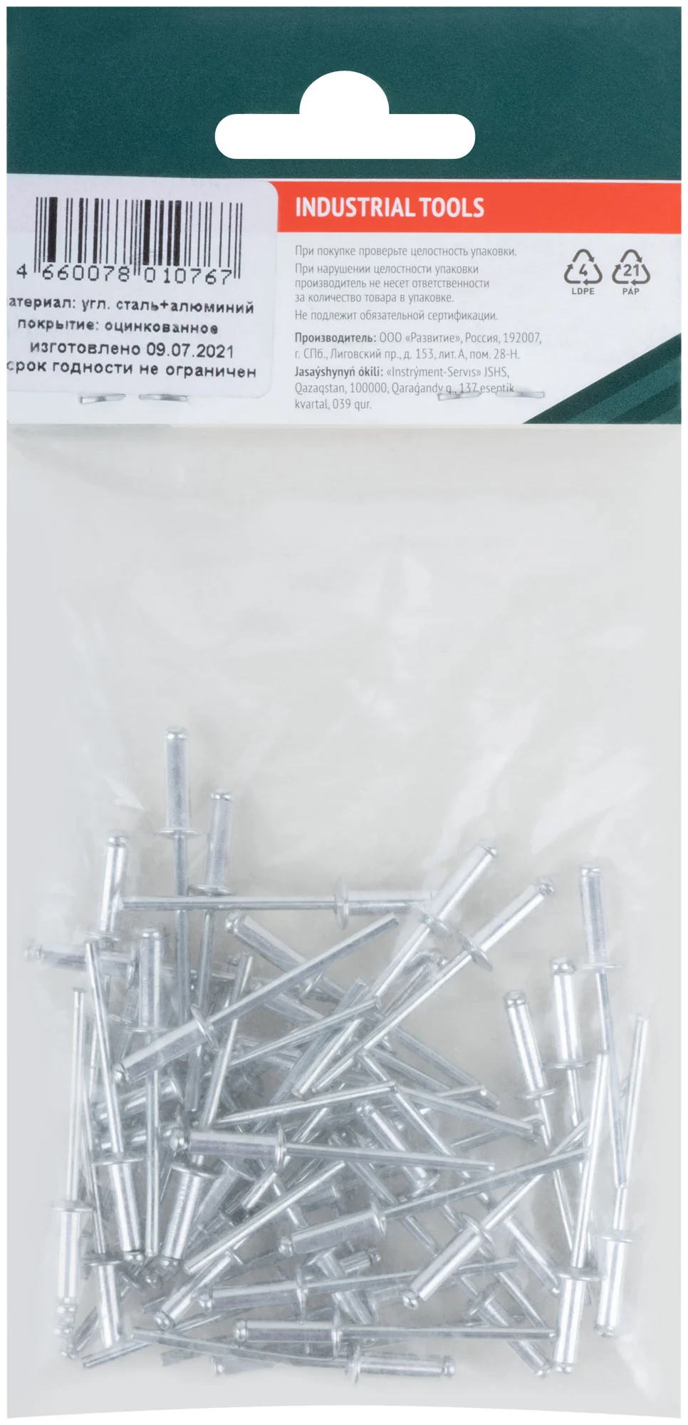 Заклепки изготовлены из алюминия, что обеспечивает легкость и прочность. Упакованы в полиэтиленовый пакет с подвесом, что облегчает хранение и транспортировку. Размер упаковки — 165x80x15 мм.