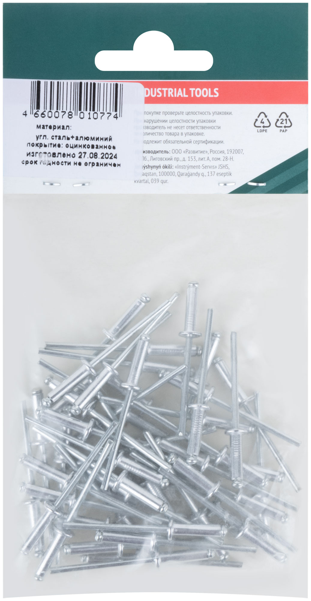Эти заклепки изготовлены из алюминия, что обеспечивает легкость и коррозионную устойчивость. Поставляются в мелкой фасовке по 50 штук, удобно упакованы в полиэтиленовый пакет с подвесом, что облегчает хранение и транспортировку.