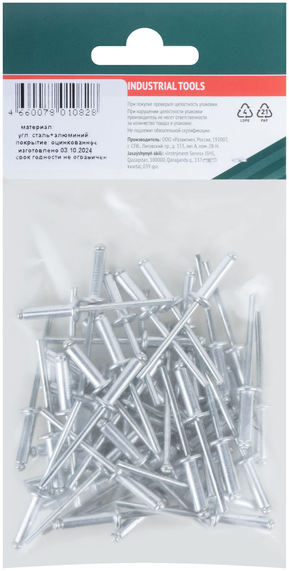 Заклепки изготовлены из алюминия, что обеспечивает лёгкость и устойчивость к коррозии. Упакованы в полиэтиленовый пакет с подвесом, что удобно для хранения и транспортировки. Компактная упаковка содержит 50 штук, что оптимально для небольших проектов.