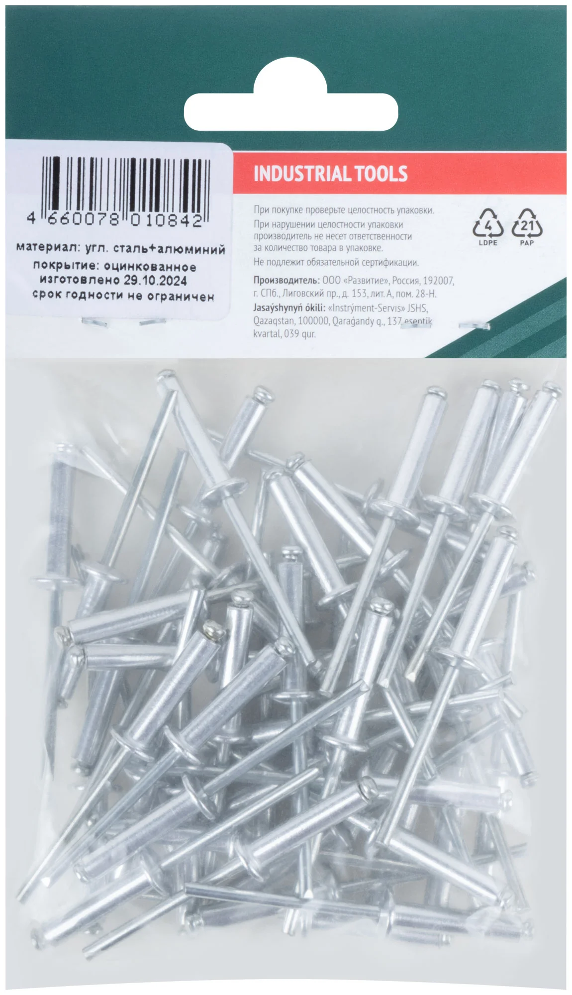 Заклепки выполнены из алюминия, что обеспечивает легкость и устойчивость к коррозии. Упакованы в полиэтиленовый пакет с подвесом, что делает их удобными для хранения и транспортировки. Размеры упаковки 165x80x15 мм и вес 94 г позволяют всегда иметь заклепки под рукой.