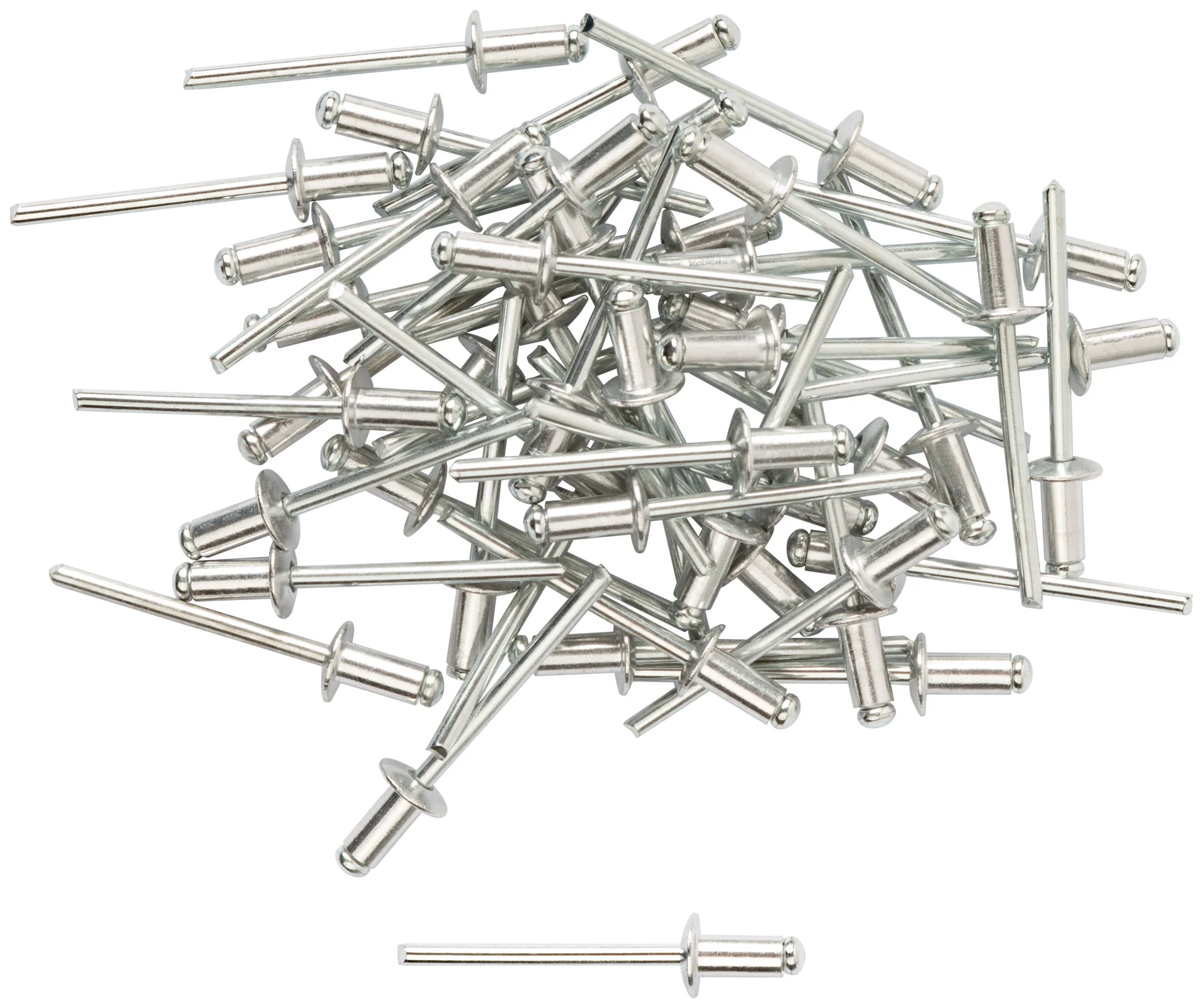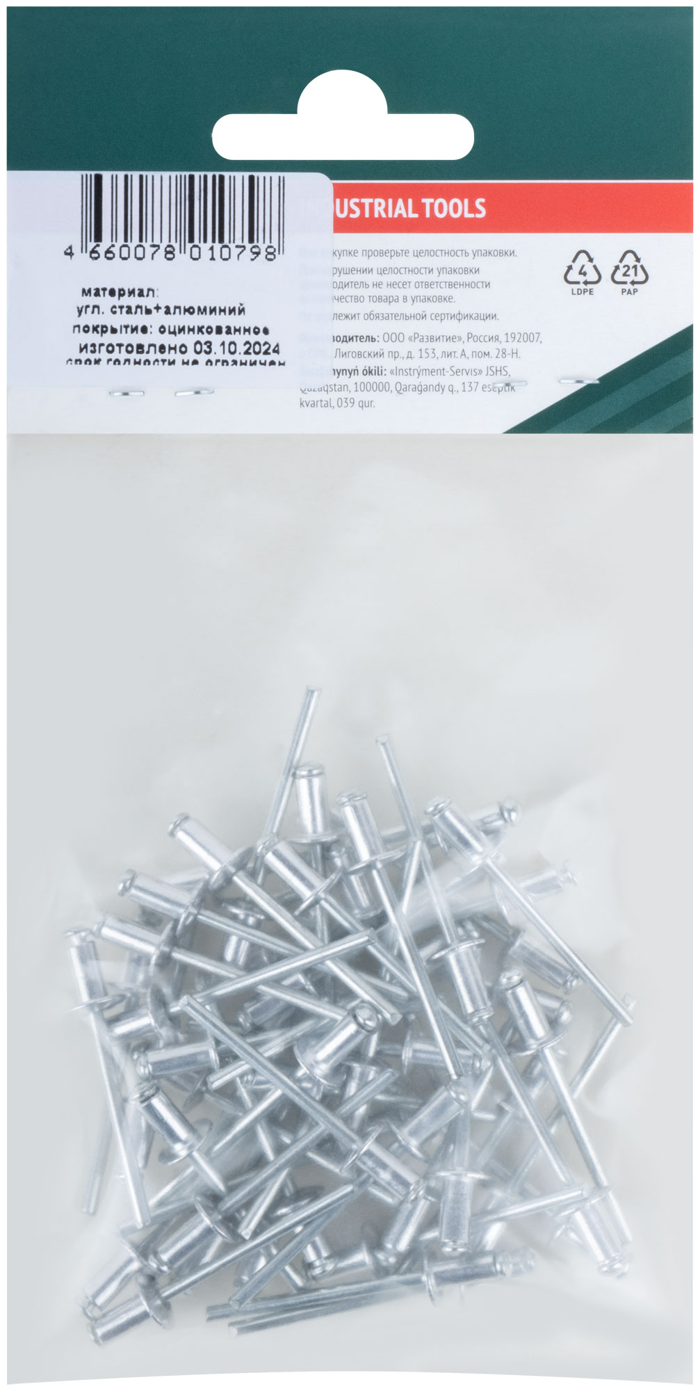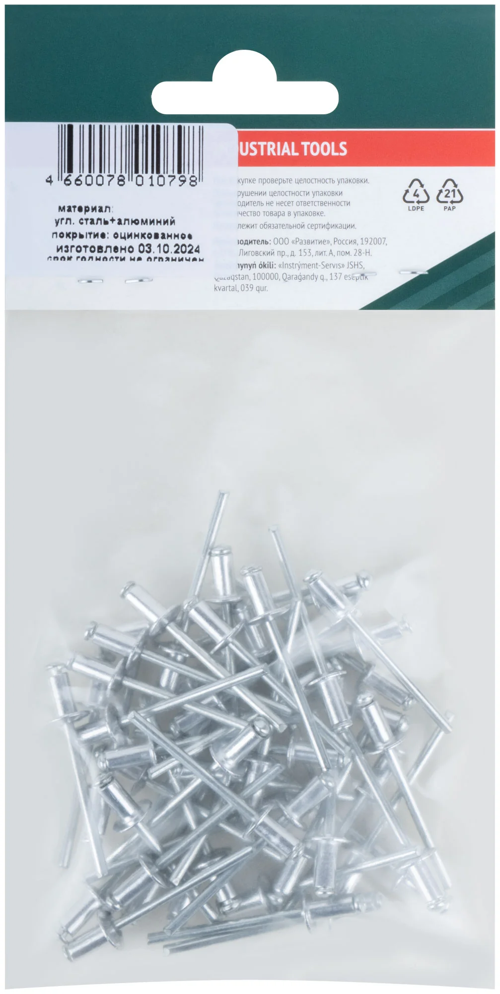 Заклепки изготовлены из алюминия, что обеспечивает легкость и устойчивость к коррозии. Упаковка из 50 штук располагается в полиэтиленовом пакете с подвесом, что удобно для хранения и транспортировки.