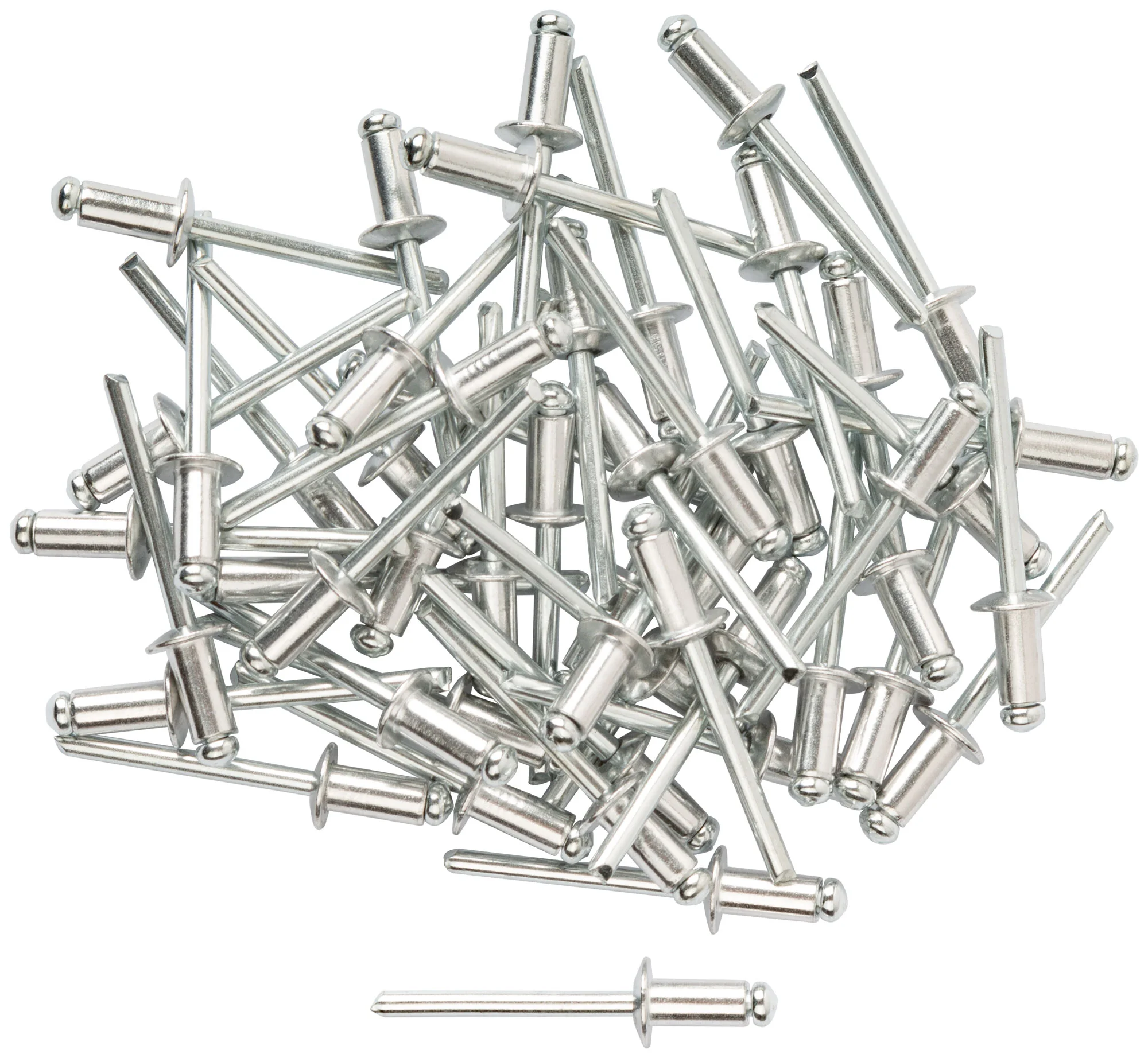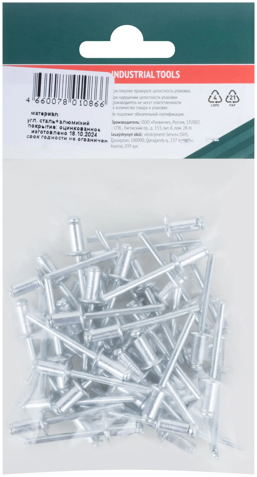 Заклепки изготовлены из алюминия, что обеспечивает их легкость и устойчивость к коррозии. Упакованы в полиэтиленовый пакет с подвесом, что удобно для хранения и транспортировки.