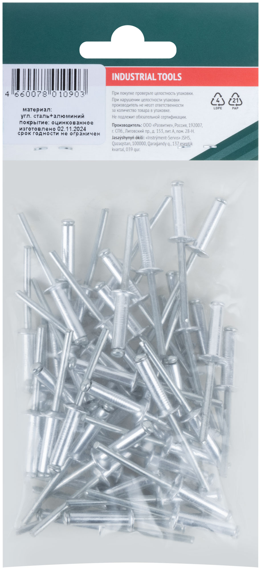 Заклепки изготовлены из алюминия, что обеспечивает легкость и устойчивость к коррозии. Фасовка из 50 штук в полиэтиленовом пакете с подвесом позволяет удобно хранить и транспортировать крепеж.