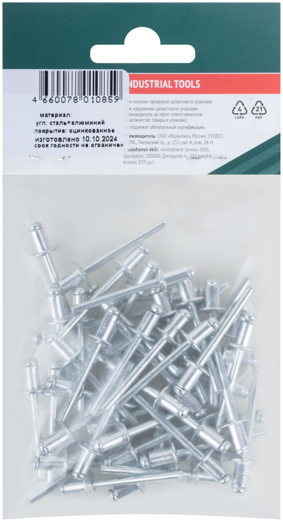 Эти заклепки изготовлены из качественного алюминия, что обеспечивает легкость и устойчивость к коррозии. Упакованы в удобный полиэтиленовый пакет с подвесом, что облегчает транспортировку и хранение. Каждая упаковка содержит 50 штук, что позволяет экономично использовать материал без излишков.