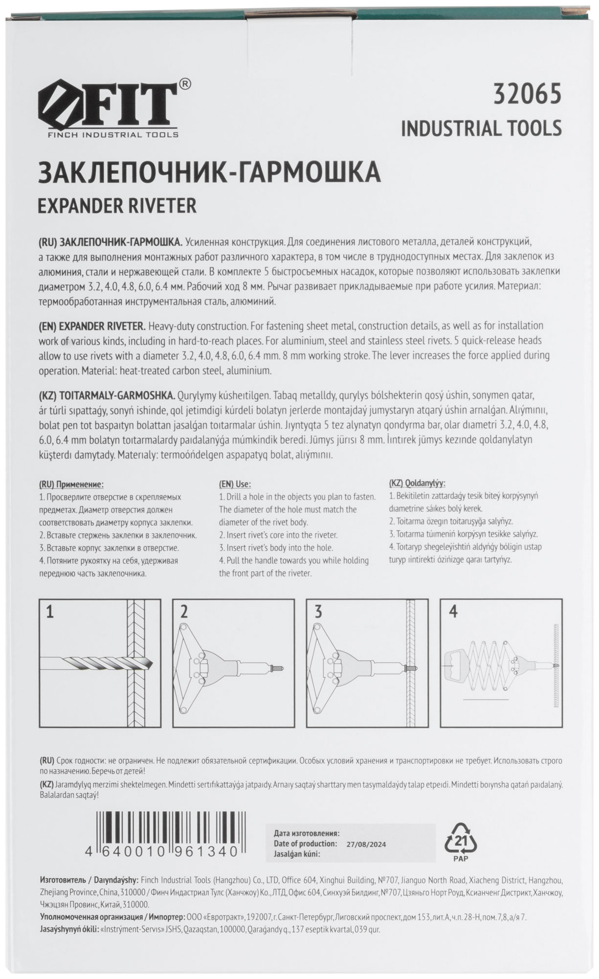 Заклепочник изготовлен из высококачественных материалов, что гарантирует долговечность и надежность в эксплуатации. Габариты 315x50x200 мм и вес 1,83 кг делают его удобным в использовании и транспортировке.