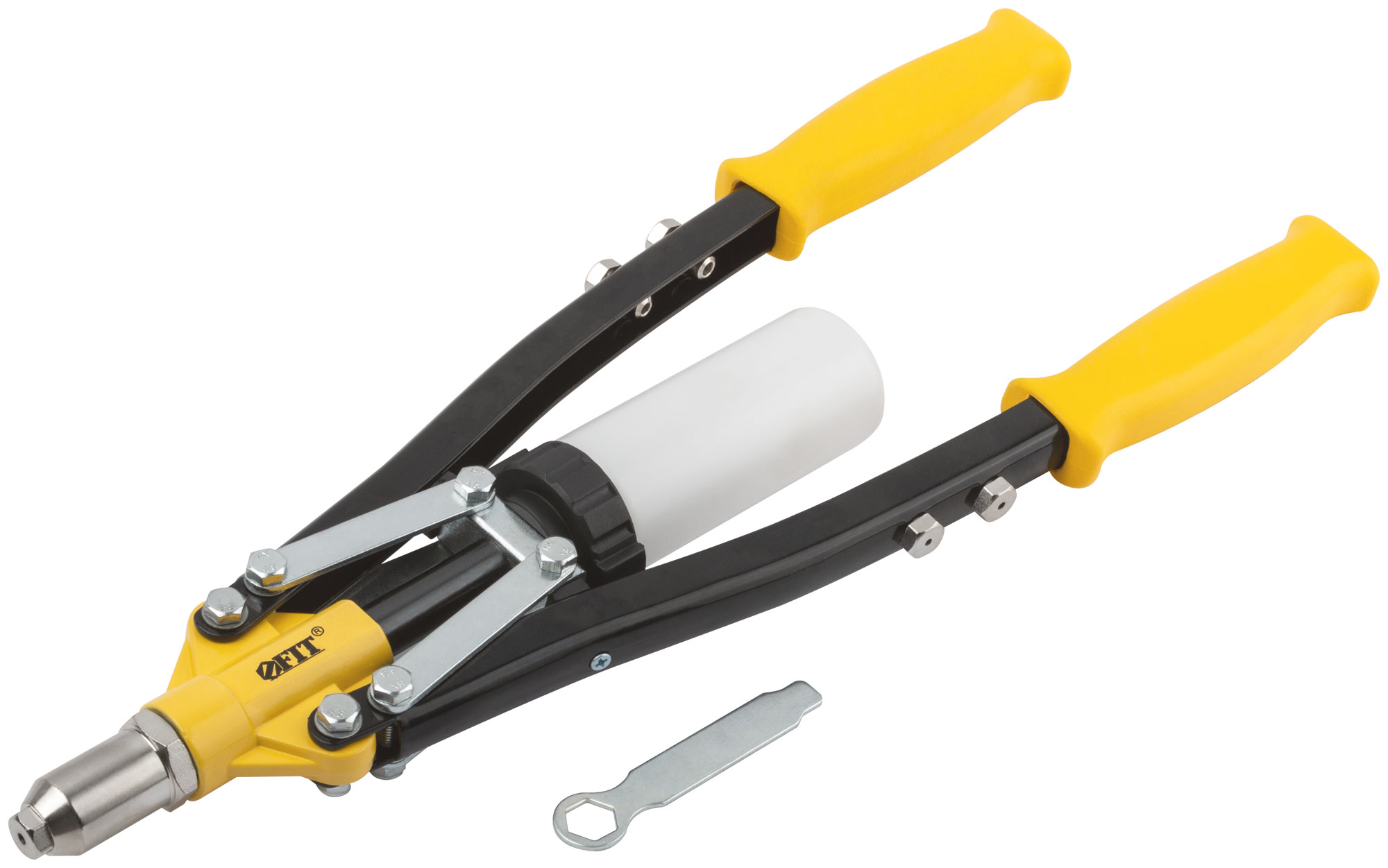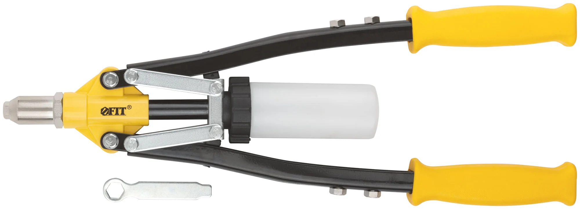Усиленный заклепочник FIT идеально подходит для работы с вытяжными заклепками из алюминия, стали и нержавеющей стали диаметром от 3,2 до 6,4 мм. Его длина и мощные ручки обеспечивают легкость и точность в установке заклепок, позволяя работать с различными материалами на строительных площадках и в мастерских.