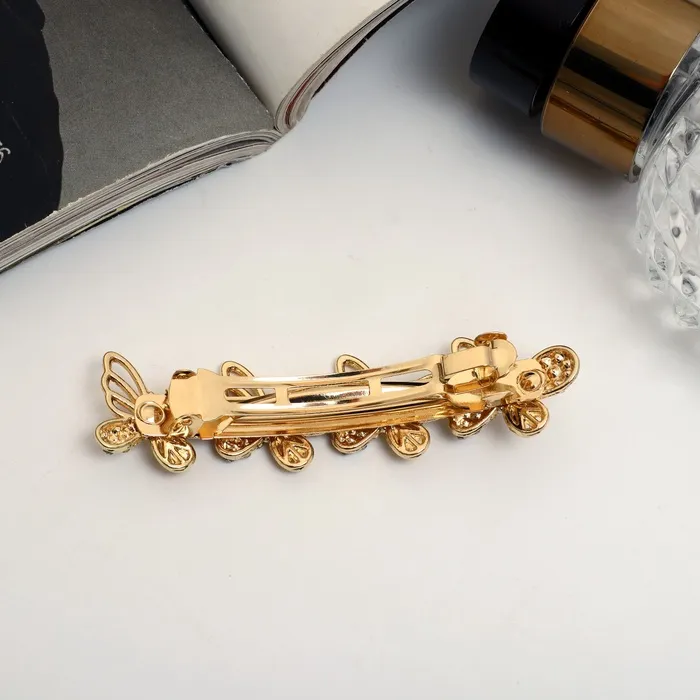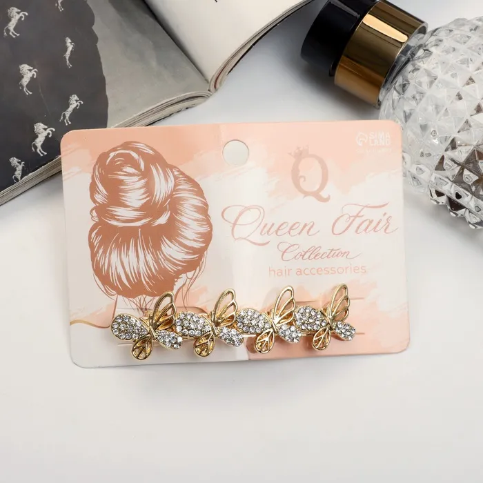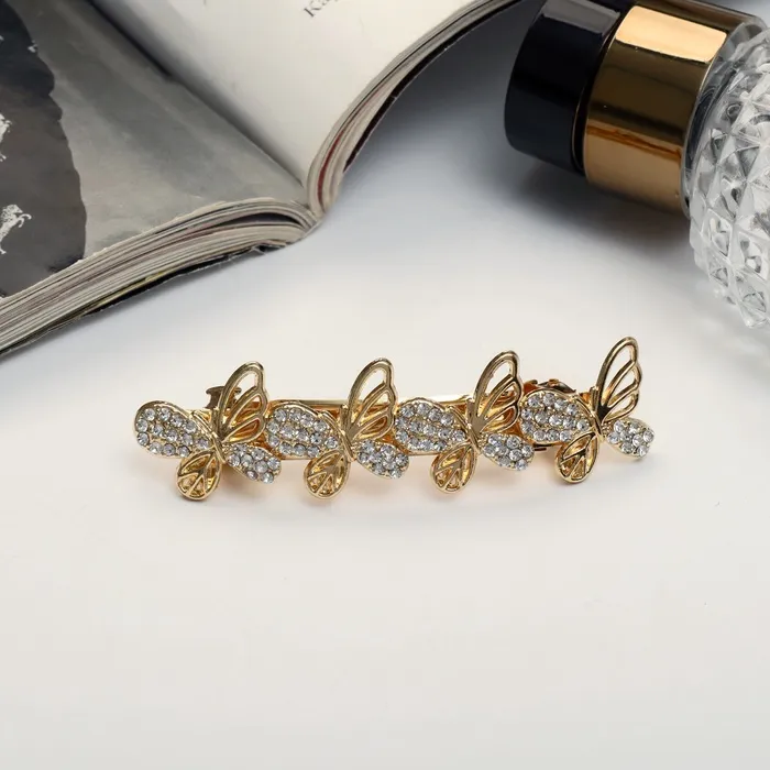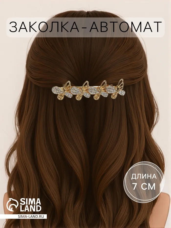 Добавьте нотку элегантности в ваш образ! Золотистая заколка-автомат с блеском и бабочками – стильный аксессуар для вашей причёски длиной 7 см, удерживающий волосы надежно и деликатно.