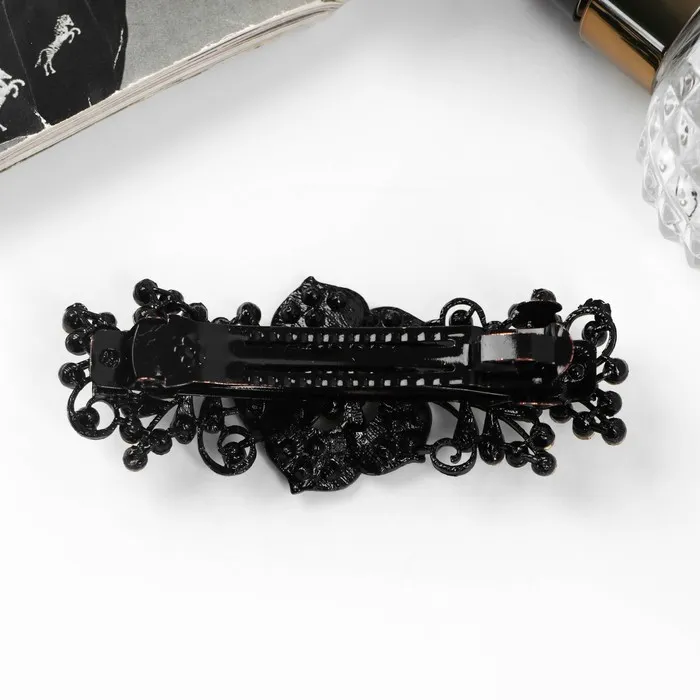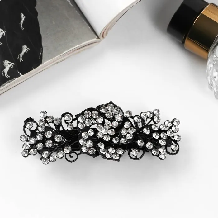 Элегантная заколка-автомат с розой, идеально подходит для создания утончённых образов. Украшение станет вашим незаменимым спутником как в будничной суете, так и на вечеринке. Серебристый и чёрный цвета в дуэте ощущаются как классика и современность в одном аксессуаре. Заколка не только надёжно фиксирует волосы, но и придаёт причёске особый шарм.