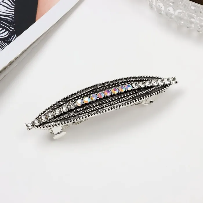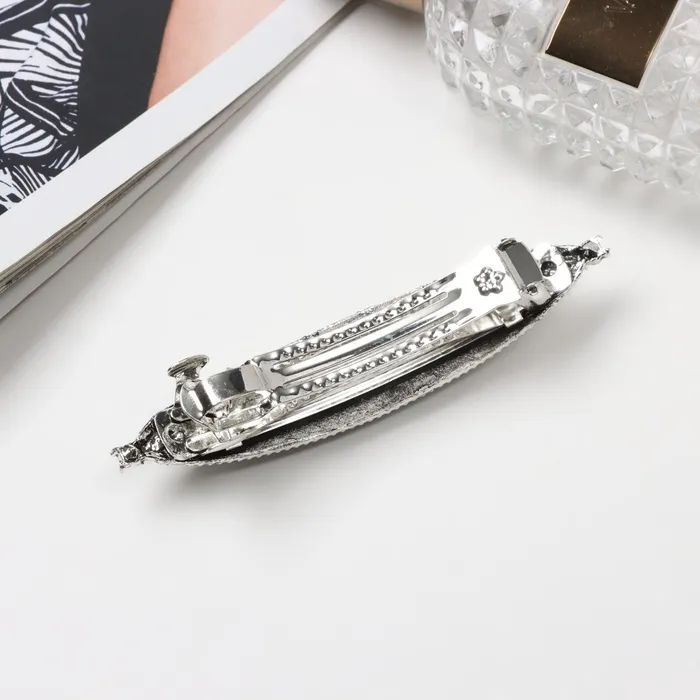 - Серебряное сияние: насыщенный серебристый цвет подчёркивает изысканность и подходит для любого случая. Заколка выполнена из металла и декорирована стеклянными элементами, добавляющими блеск вашему образу.