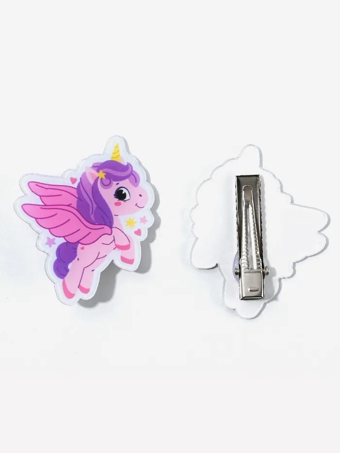 Модные красивые заколки - украшения клик-клак для маленьких принцесс с удобным механизмом автомат. Заколки станут отличным подарком на любой праздник. Декоротивные, безопасные фигурки единорожек понравятся малышке, девочке. Модные и яркие заколки с единорогом с легкостью украсят прическу, зафиксируют прядь волос или челку. От таких детских заколок в восторге и взрослые, и дети. Крокодильчики легко крепить на голову, подойдут для всех видов волос. Порадуйте себя и ребенка нашими детскими заколками. ВНИМАНИЕ! С заколки необходимо снять защитную пленку перед использованием!