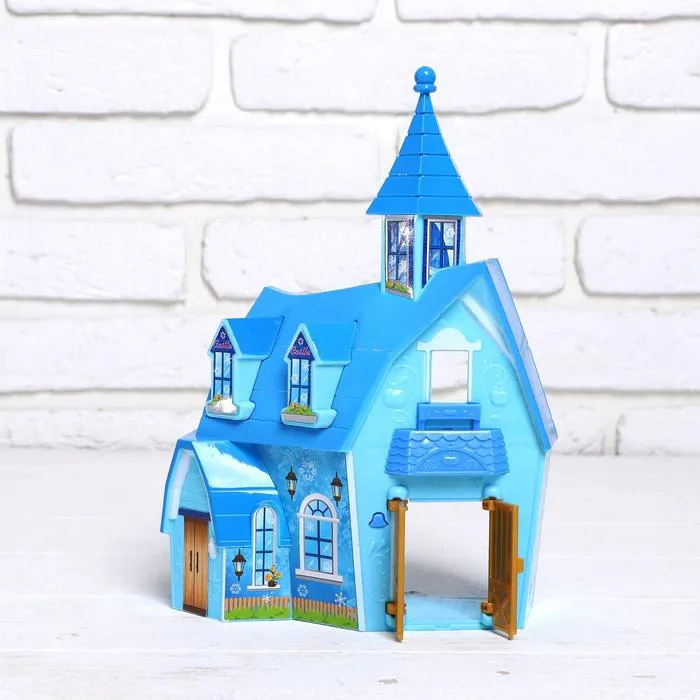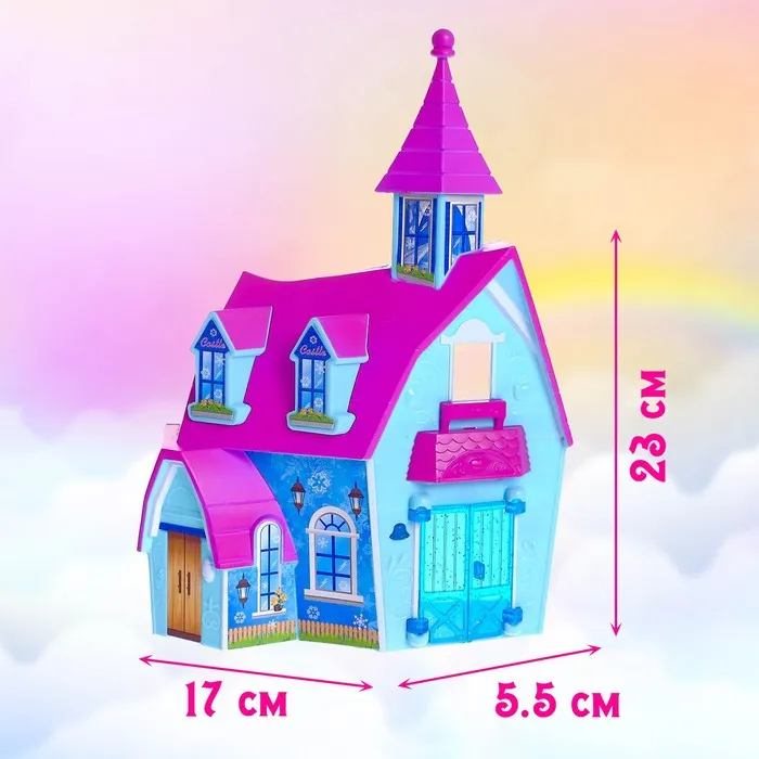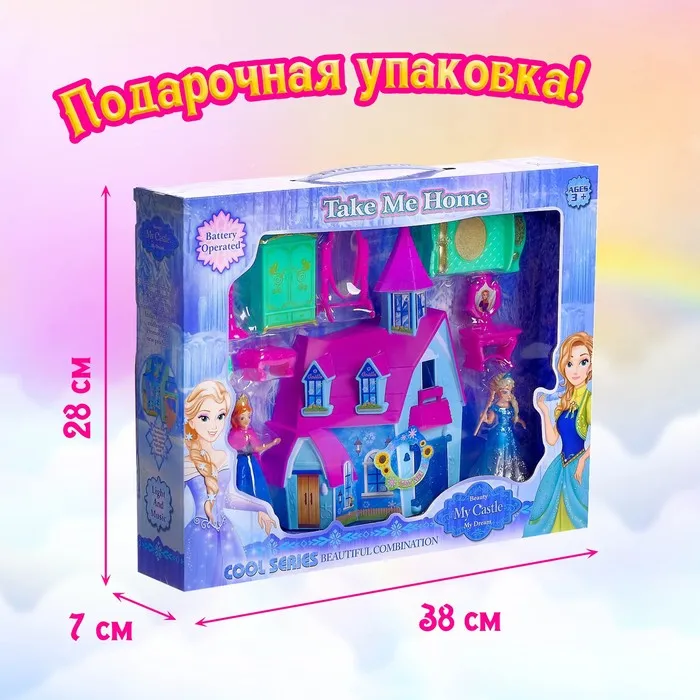 В наборе представлены 2 куколки высотой 10 см, мебель для спальни, как на фото. Домик не складной, высота — 28,5 см. У сказочного замка есть световые и звуковые эффекты. Для игры вам понадобятся 3 батарейки типа LR44 (V13GA, AG13, LR1154), есть в комплекте.