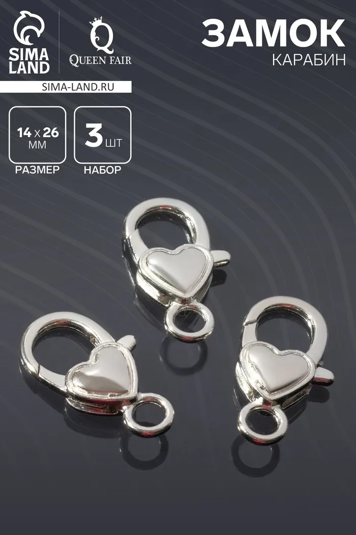 Замок-карабин «Сердечко» гладкое, (набор 3 шт.), 14×26 мм, цвет серебро — Характеристики