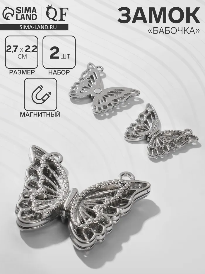 Замок магнитный «Бабочка» ажур — это стильное и элегантное решение для ваших украшений. В наборе 2 замка серебряного цвета, выполненные в виде изысканных ажурных бабочек. Эти магнитные замки идеально подойдут для создания уникальных ожерелий, браслетов и других аксессуаров, придавая им не только функциональность, но и утончённый дизайн.