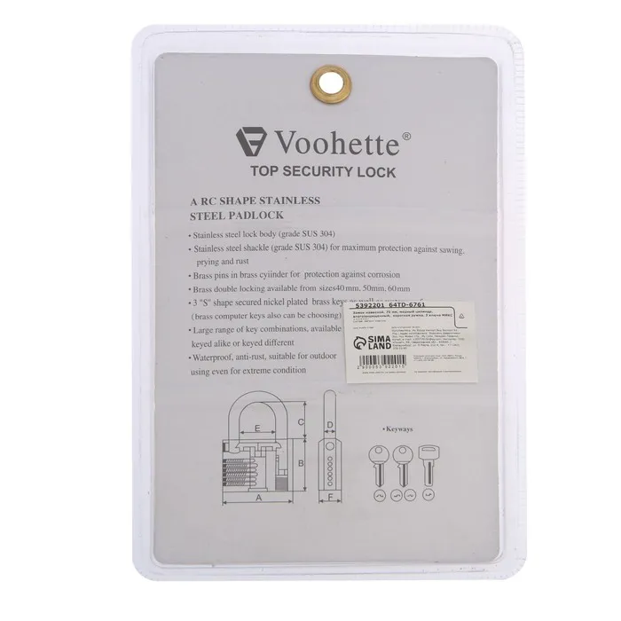 Замок навесной, 70 мм, медный цилиндр, влагозащищенный, короткая дужка, 3 ключа МИКС — Характеристики