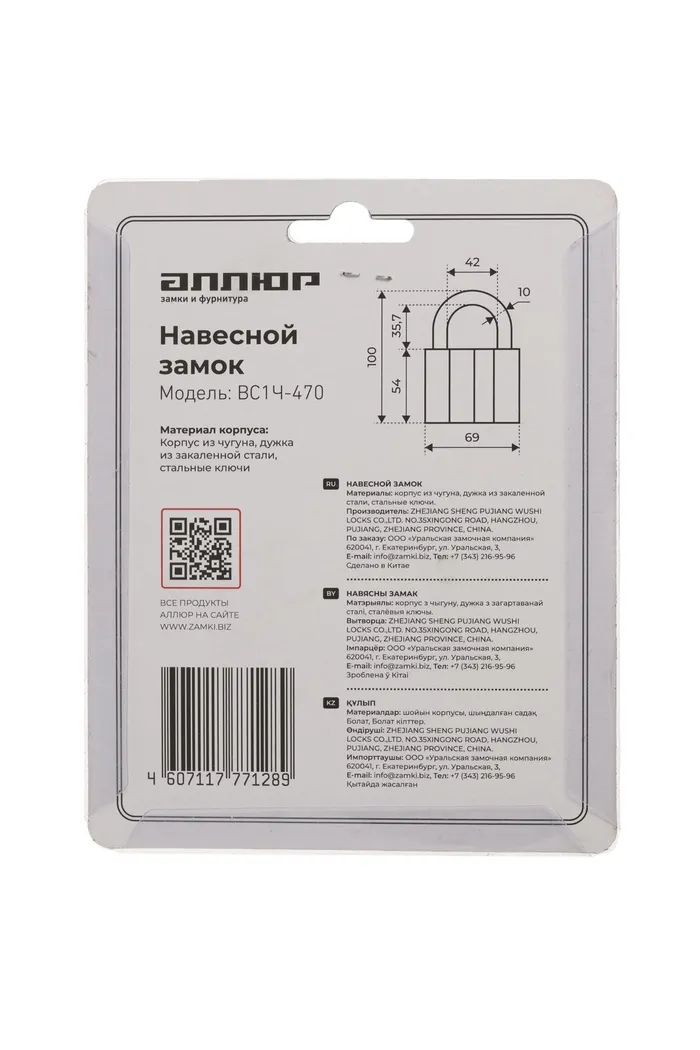 Замок навесной «АЛЛЮР» ВС1Ч-470, дужка d=10 мм, 5 ключей — Характеристики