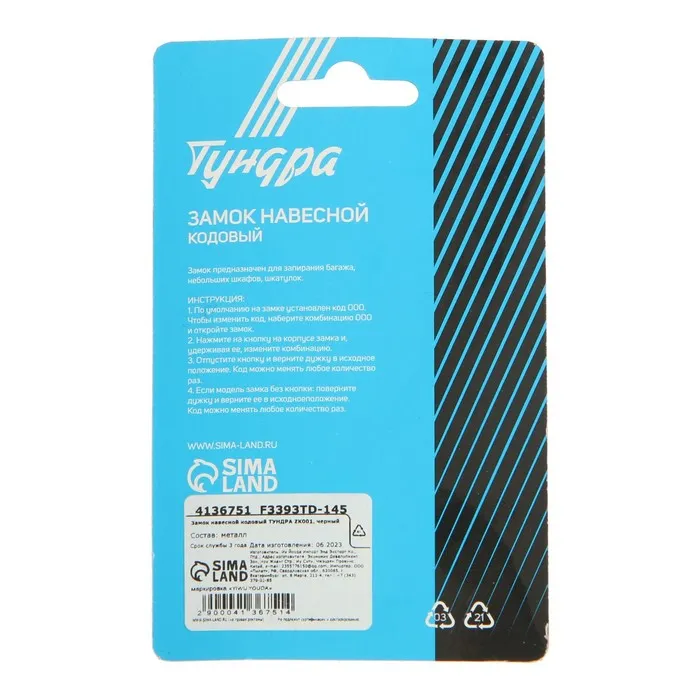 Замок навесной кодовый ТУНДРА ZK001, черный — Характеристики