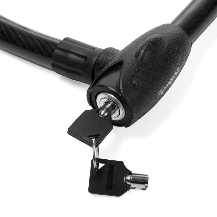 Замок предназначен для защиты от угона велосипедов, самокатов, колясок, мотоциклов, скутеров. Оплетка из ПВХ защищает трос от влаги.