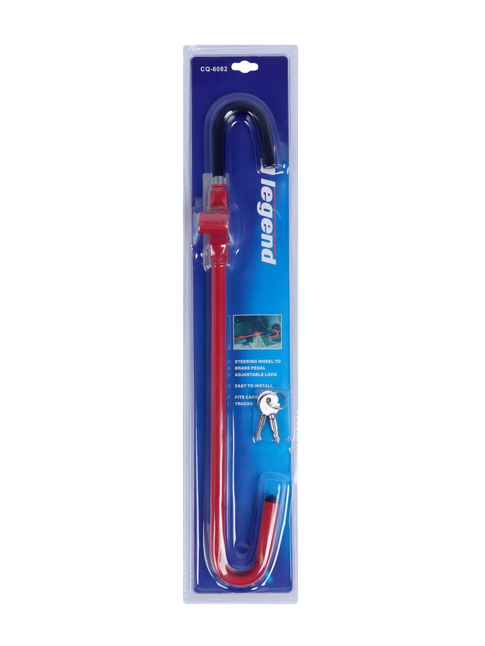 Замок противоугонный на руль автомобиля изготовлен из прочной стали, которую невозможно распилить без использования специальных средств. Замок одной стороной фиксируется на педали, другой — на рулевом колесе и блокирует поворот руля.