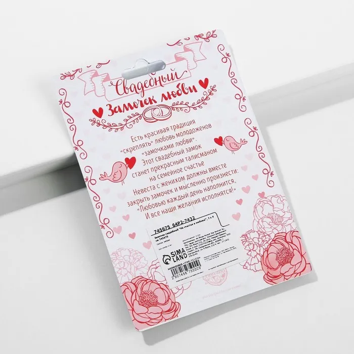 Замок для торжественной свадебной традиции - это символ любви. Навесной замок любви на свадьбе становится символом нерушимого союза, заключенного влюбленными в этот день. По традиции замок вешается на мост, загадывается желание о счастливой семейной жизни. Это делается для того, чтобы никто никогда не смог открыть этот замок и нарушить клятву, данную влюбленными. Свадебный замок можно повесить на мост по традиции или на дерево в специалных парках или аллеях молодожен, которые есть во многих городах. Традиция закрывать замок на свадьбу объединяет сердца мужа и жены навсегда. Свадебный декоративный замочек будет отлично смотреться на фотосессии и видео.