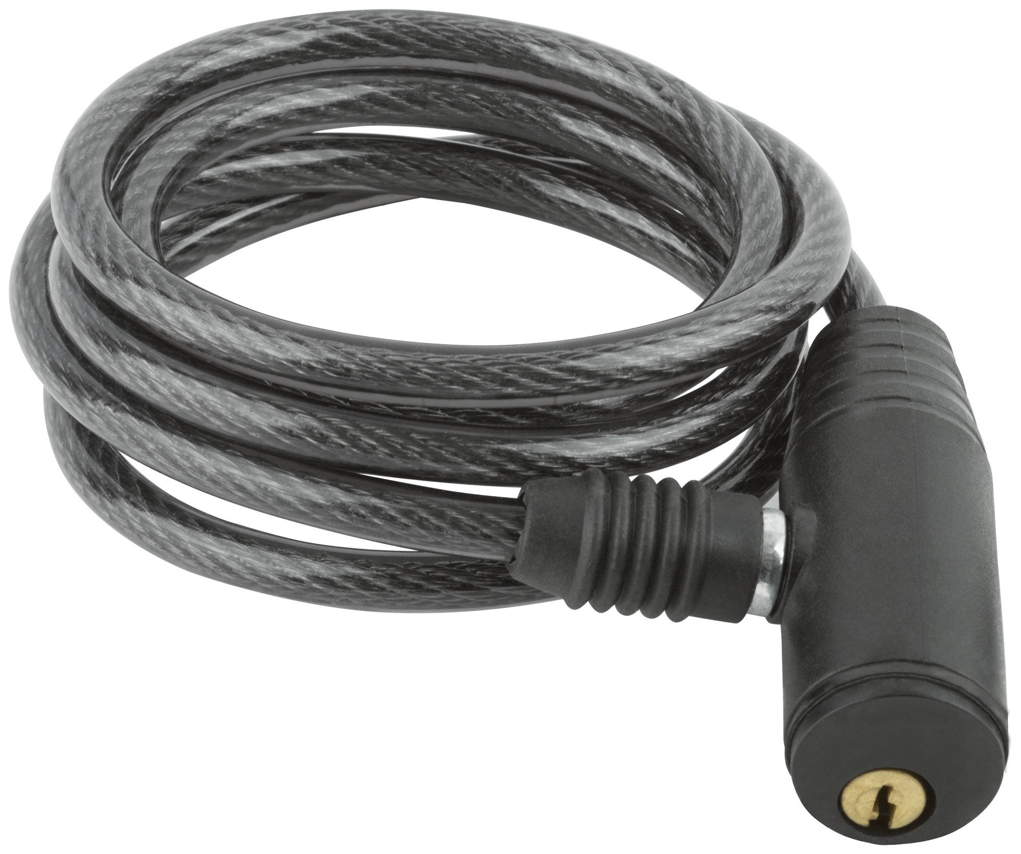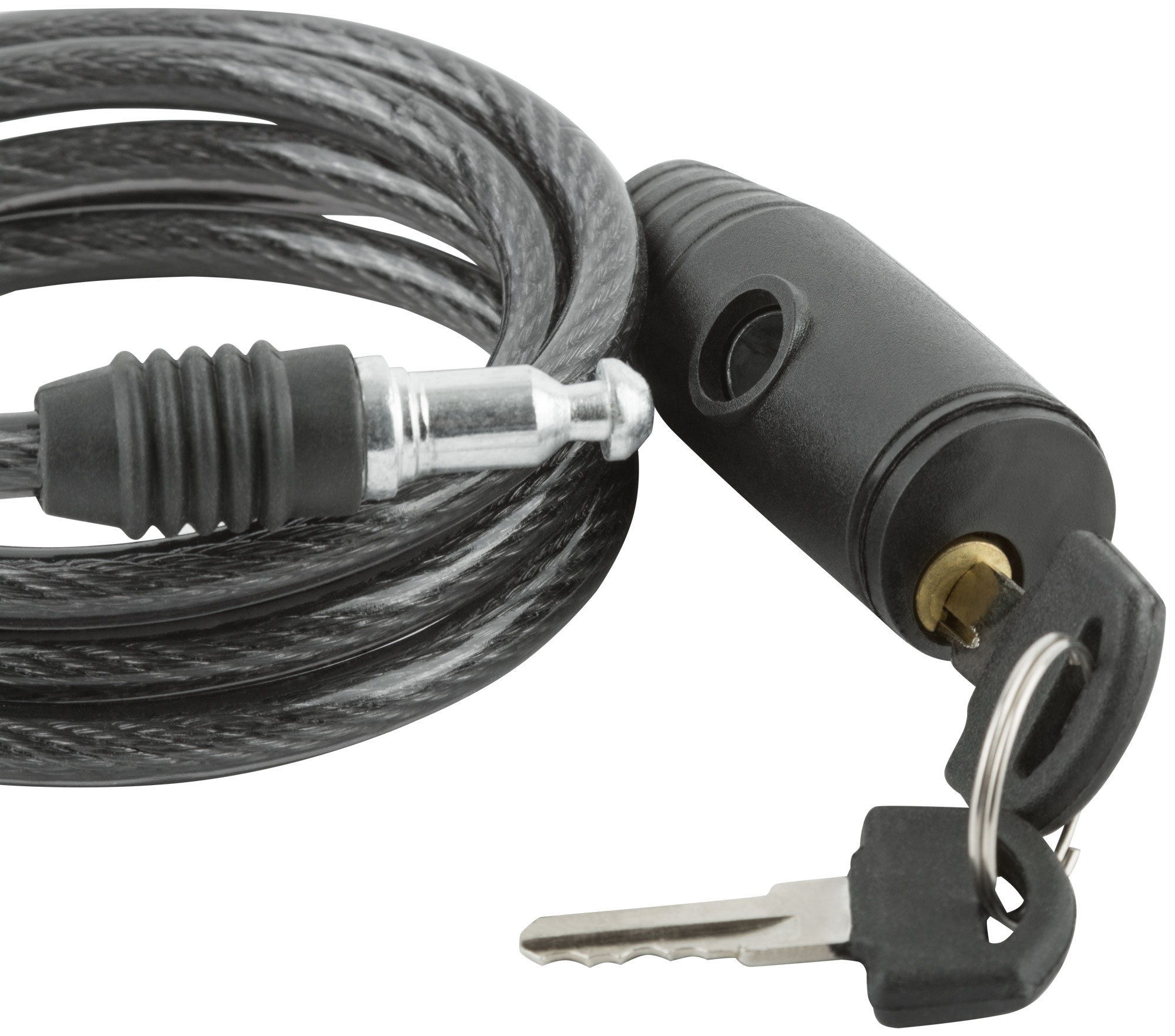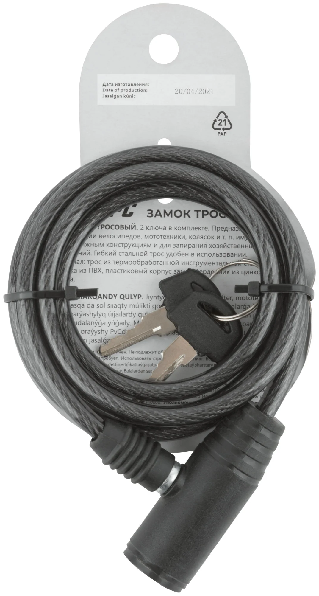 Замок изготовлен из прочного троса инструментальной стали, защищенного ПВХ-оплеткой для предотвращения царапин. Сердечник замка выполнен из цинкового сплава, а пластиковый корпус защищает от коррозии и погодных воздействий. В комплект входят два ключа, что обеспечивает дополнительное удобство.