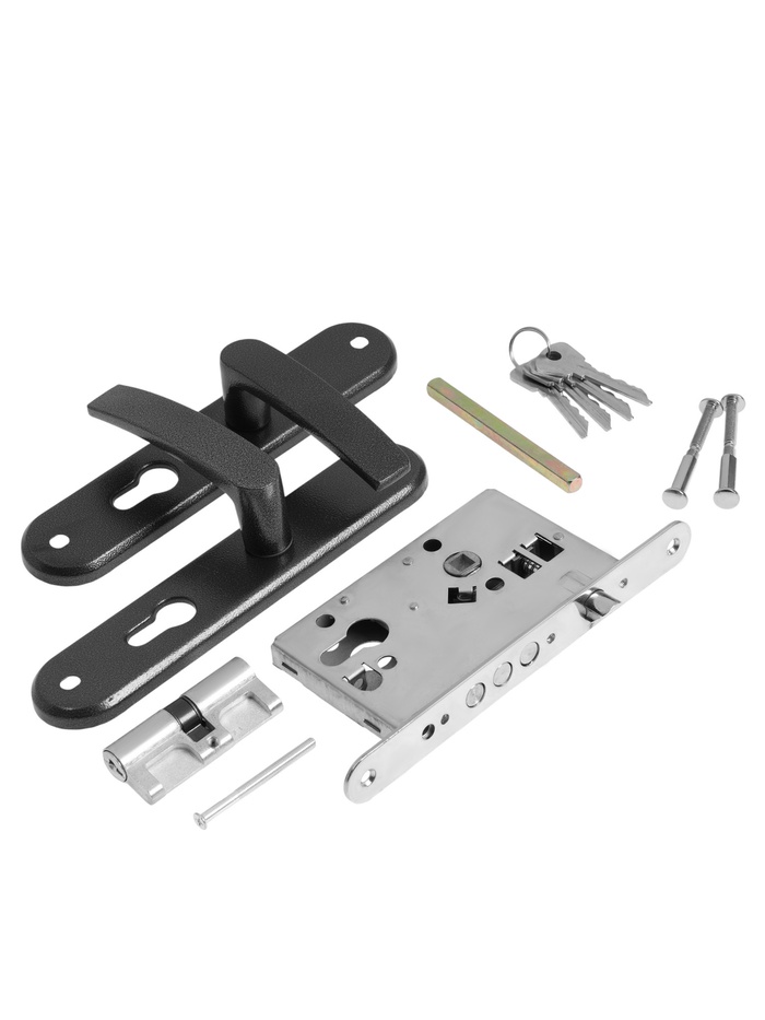 - Цилиндровый механизм: Позволяет запирать дверь снаружи ключом, а изнутри — поворотной кнопкой.