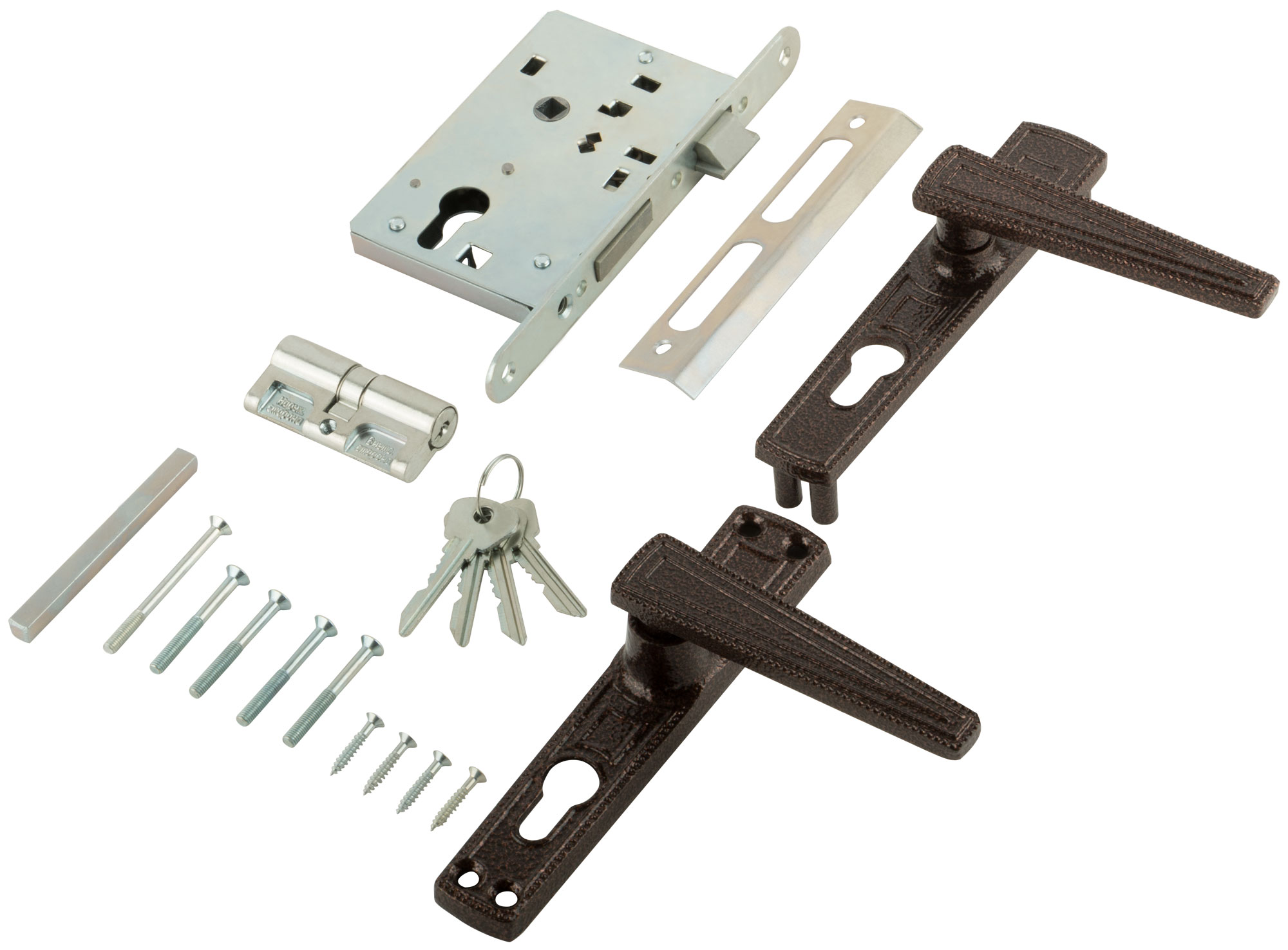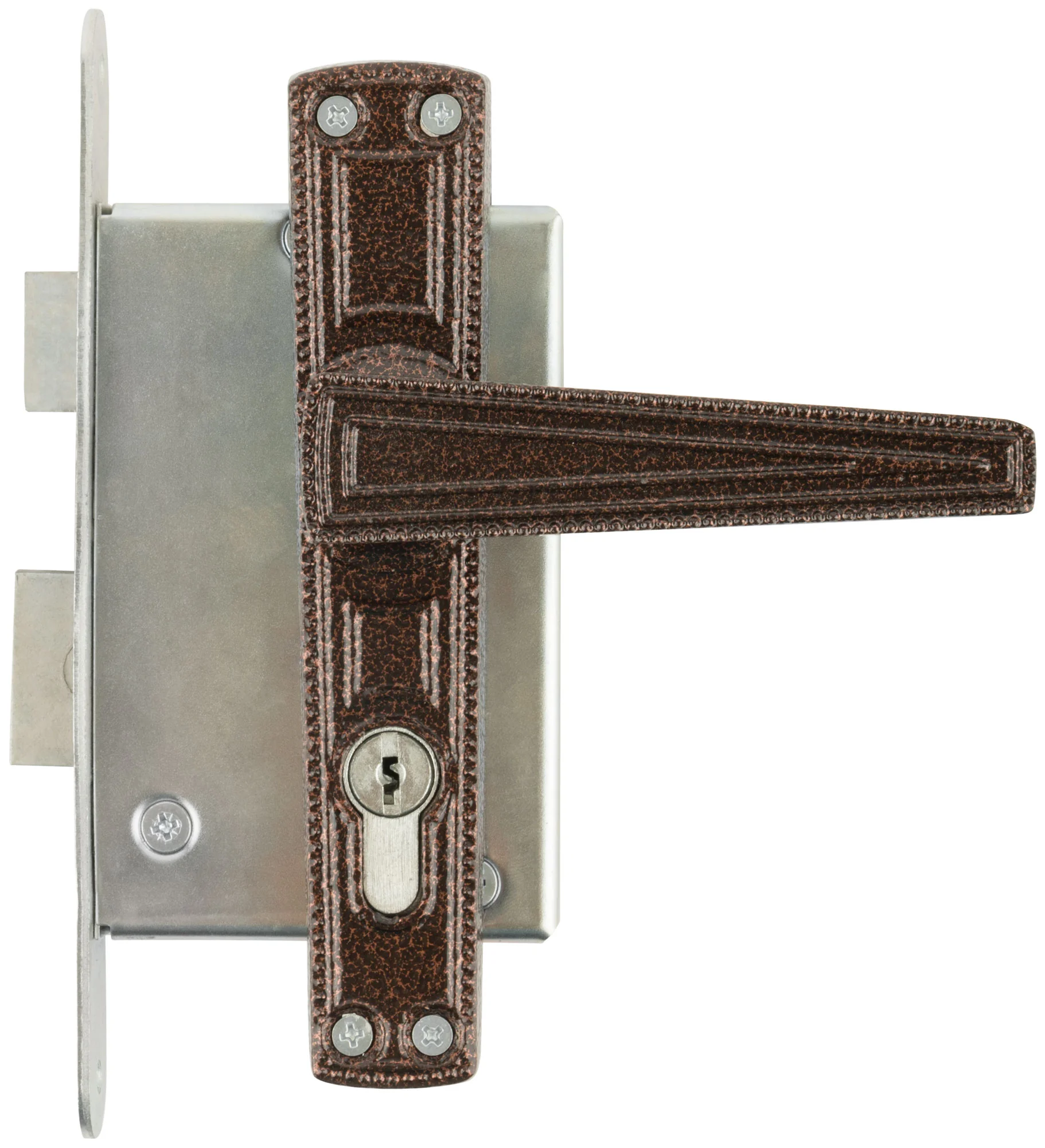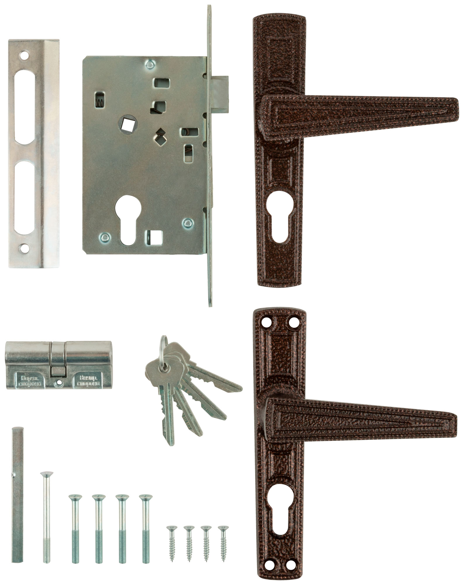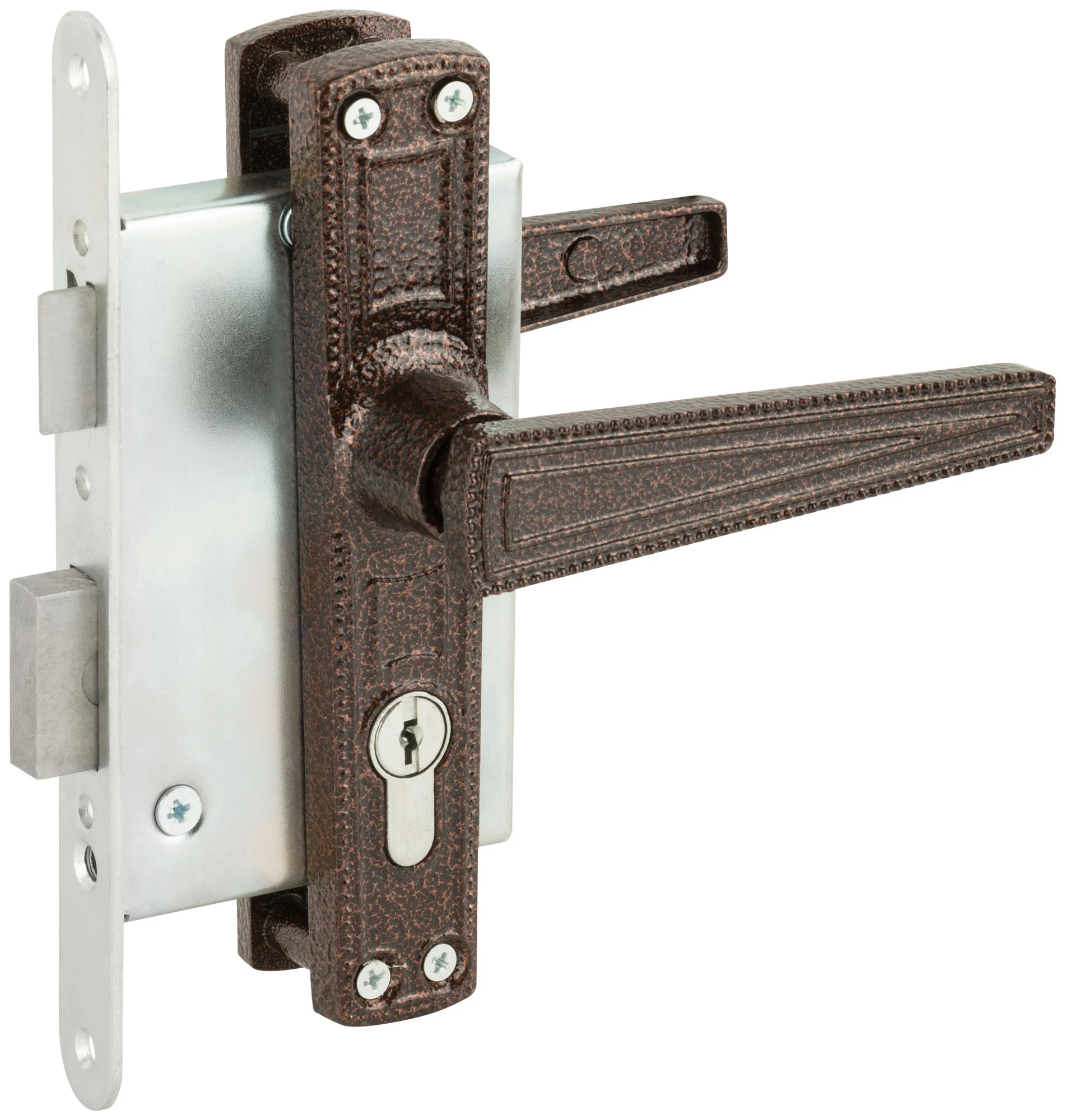 Конструкция замка включает цилиндровый механизм с межцентровым расстоянием 85 мм и трехстержневой засов, что гарантирует защиту от взлома. Фалевые ручки покрыты полимером, что обеспечивает долговечность и приятный внешний вид.