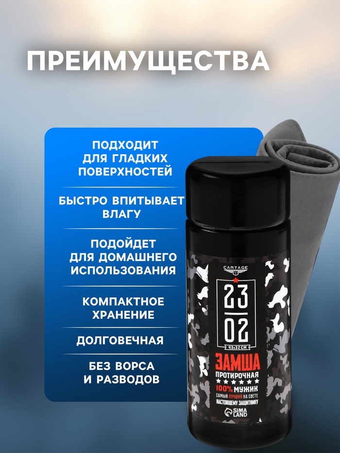 Замша протирочная Cartage, размером 43х32 см, станет отличным дополнением к любому автомобилю. Она предназначена для протирки стекол, фар и поверхности кузова, а также для удаления влаги и грязи. Особенностью данной замши является ее дизайн, выполненный в тематике праздника 23 февраля.