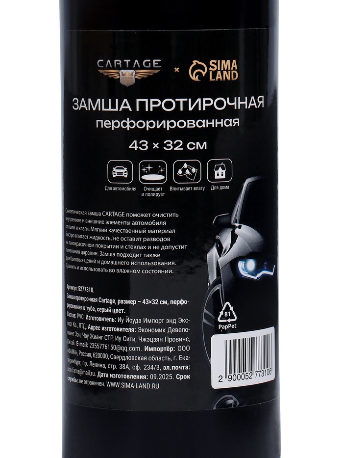 Синтетическая замша Cartage поможет очистить внутренние и внешние элементы автомобиля от пыли и влаги. Мягкий качественный материал быстро впитает жидкость, не оставит разводов на лакокрасочном покрытии и стеклах и не допустит появление царапин. Замша подходит также для бытовых целей и домашнего использования. Хранить и использовать во влажном состоянии.