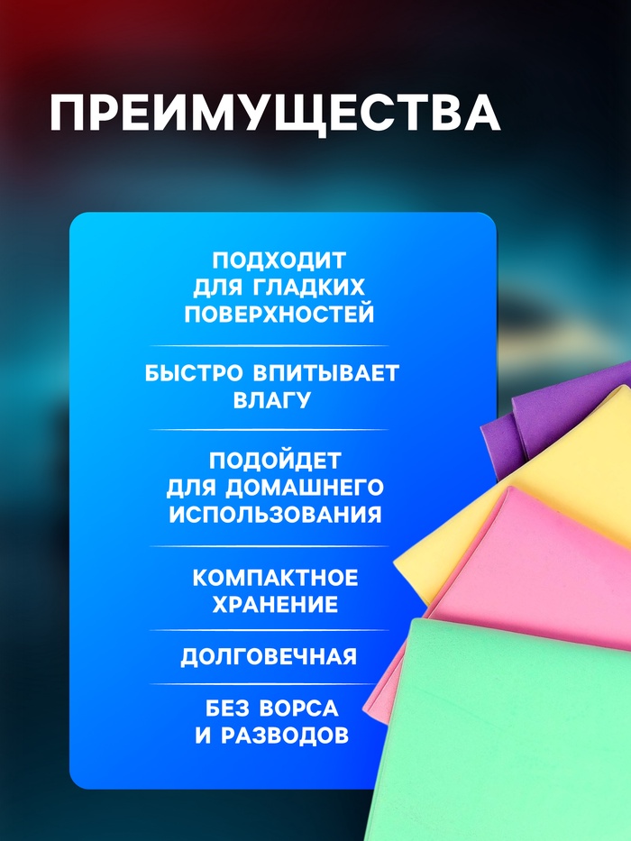 С помощью протирочной замши TORSO вы с лёгкостью очистите элементы автомобиля от пыли и грязи без применения химических средств. Она быстро впитает жидкость и не оставит разводов на лакокрасочном покрытии и стёклах. Мягкий качественный материал не допустит появления царапин. Так же широко используется в быту при чистке зеркал, окон, и мебели.