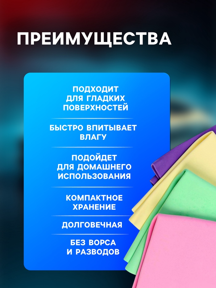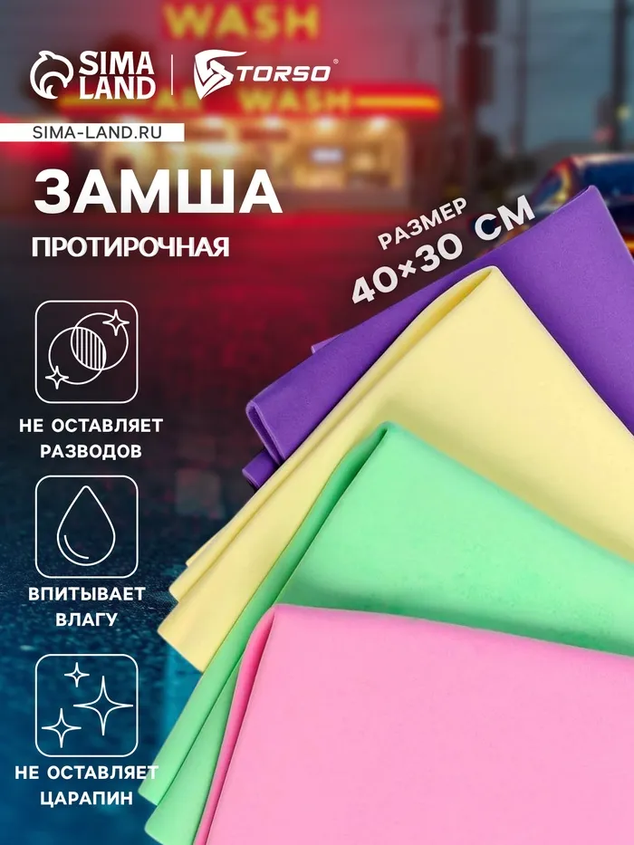 С помощью протирочной замши TORSO вы с лёгкостью очистите элементы автомобиля от пыли и грязи без применения химических средств. Она быстро впитает жидкость и не оставит разводов на лакокрасочном покрытии и стёклах. Мягкий качественный материал не допустит появления царапин. Так же широко используется в быту при чистке зеркал, окон, и мебели.