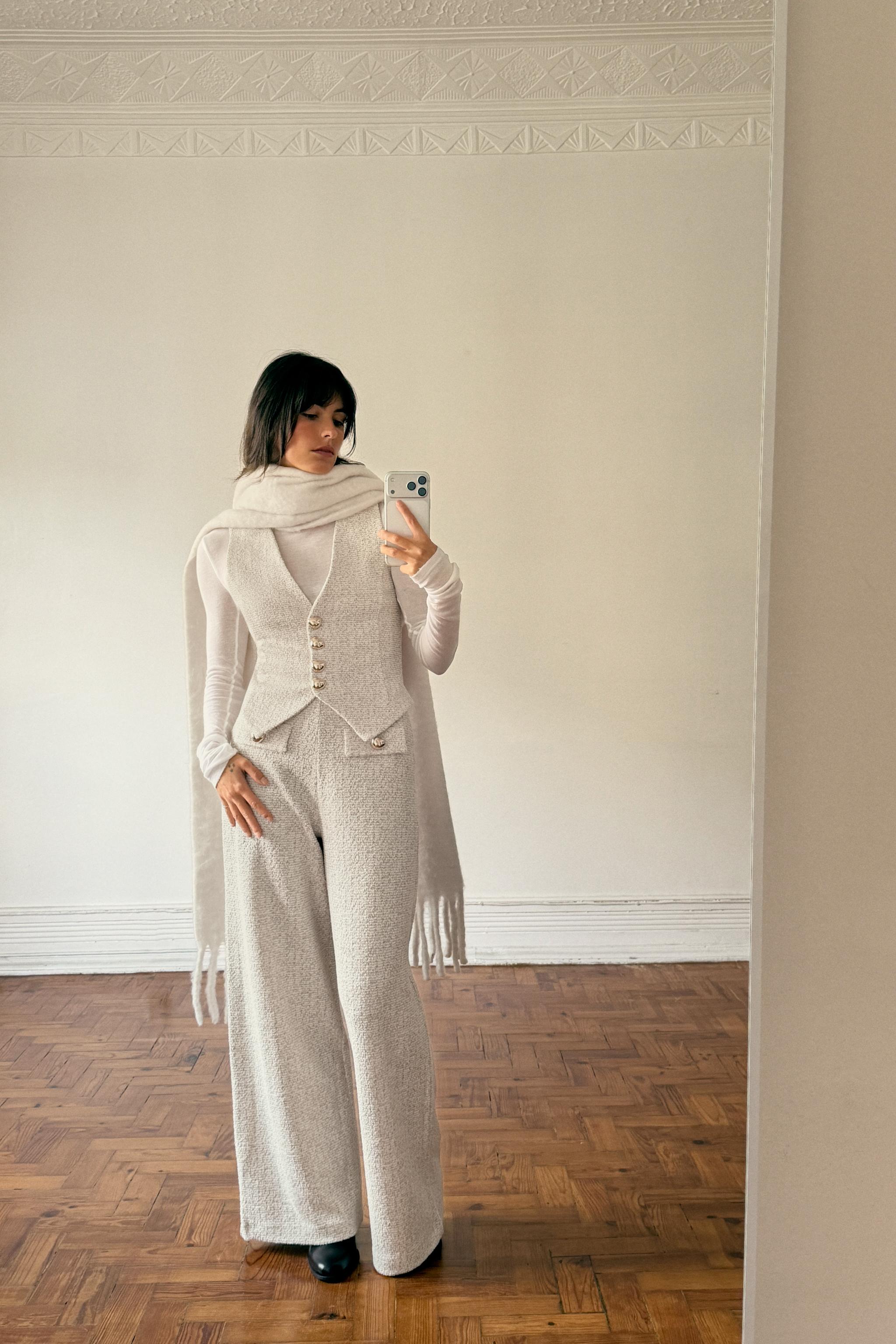 Внешняя сторона: 45 % полиэстер, 25 % вискоза, 24 % хлопок, 5 % металлизированное волокно, 1 % эластан