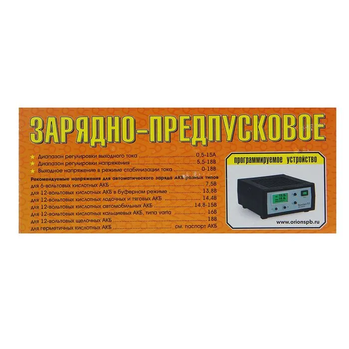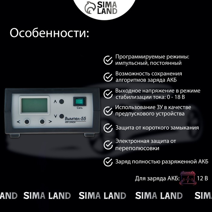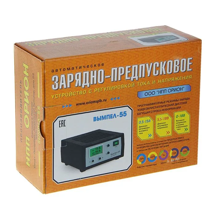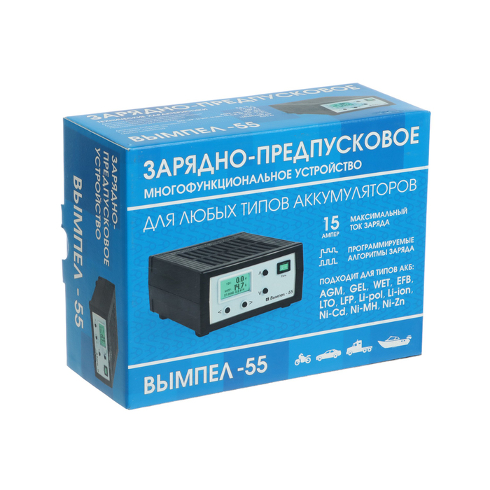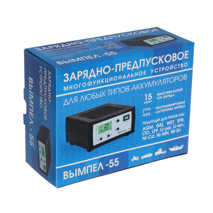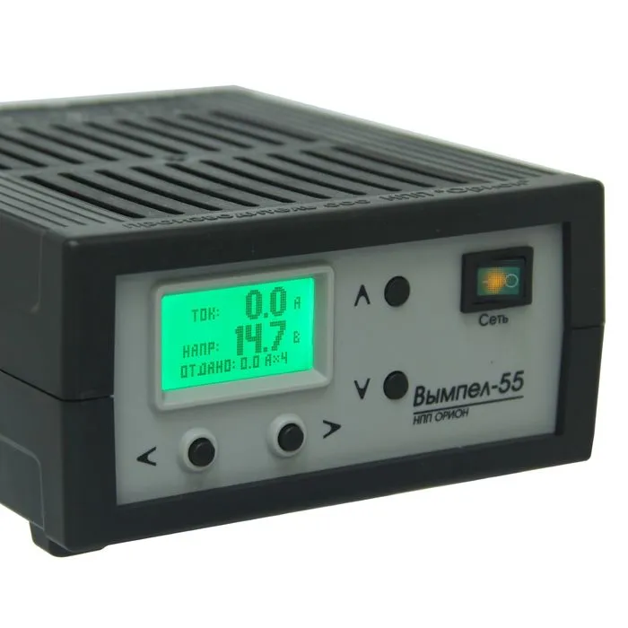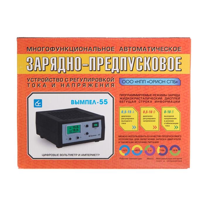 Зарядно-предпусковое устройство «Вымпел-55» отлично справляется с поставленными задачами. Двойная защита от перегрева и уменьшение тока в конце работы делают данную модель особенно безопасной в использовании. Входной ток можно регулировать в диапазоне от 0,5 до 15 А, а напряжение — от 7,5 до 18 В. Автоматическое включение и выключение происходит благодаря встроенному таймеру. Прибор зарядит даже полностью разряженный аккумулятор. Используйте устройство как блок питания, или в качестве предпускового устройства для облегчения запуска двигателя. Вам понравится удобный многострочный жидкокристаллический дисплей, который покажет статистику зарядов. Зарядно-предпусковое устройство «Вымпел-55» не подведёт вас в критической ситуации!