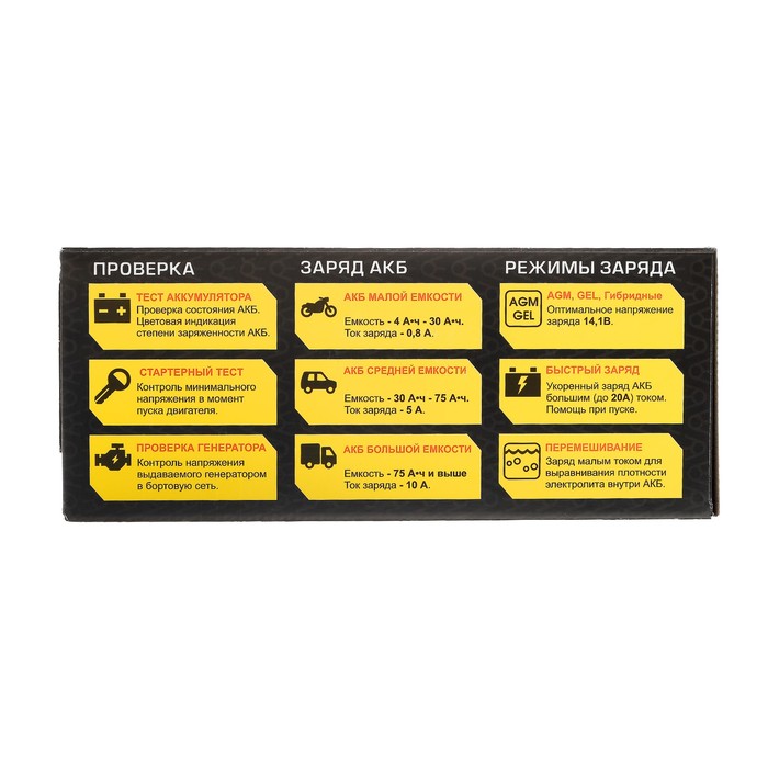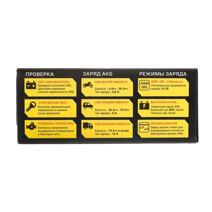 Зарядно-предпусковое устройство "Вымпел-56" с диагностикой АКБ, стартера, генератора, 20 А, 12 В, для гелевых, кислотных и AGM АКБ — Характеристики