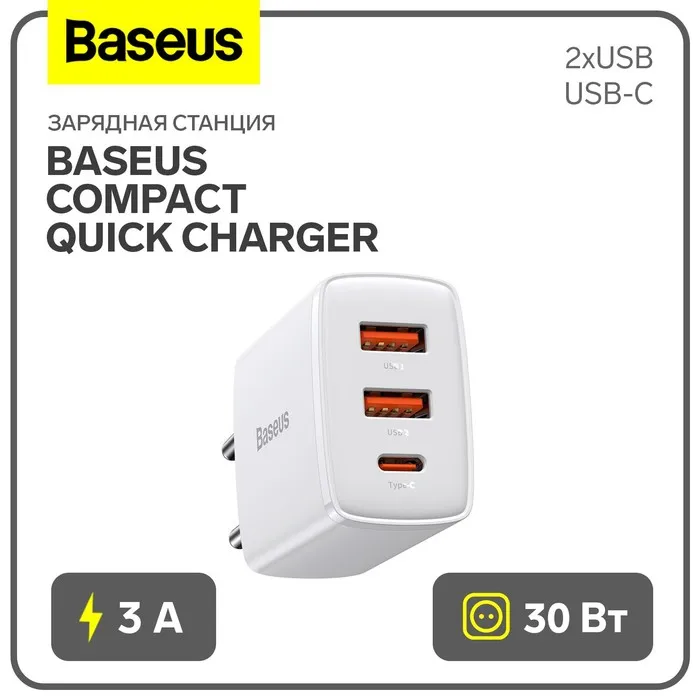 Зарядное устройство Baseus Compact Quick Charger 2*USB+USB-C, 3A, 30W, белый — Характеристики