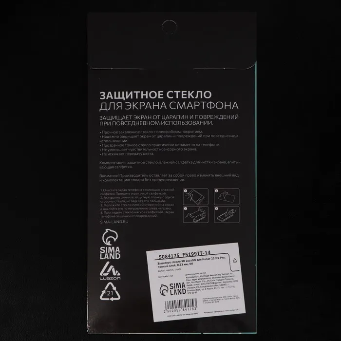 Защитное стекло 9D LuazON для Honor 20/20 Pro, полный клей, 0.33 мм, 9Н, черное — Характеристики