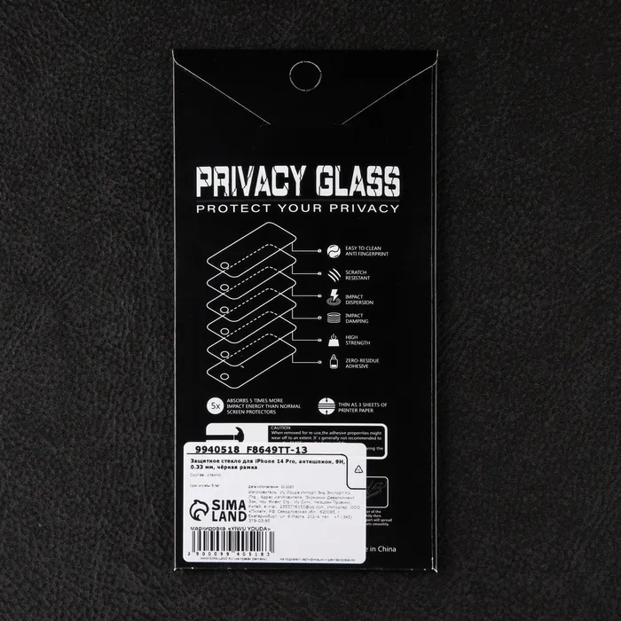Защитное стекло для iPhone 14 Pro, антишпион, 9H, 0.33 мм, чёрная рамка — Характеристики