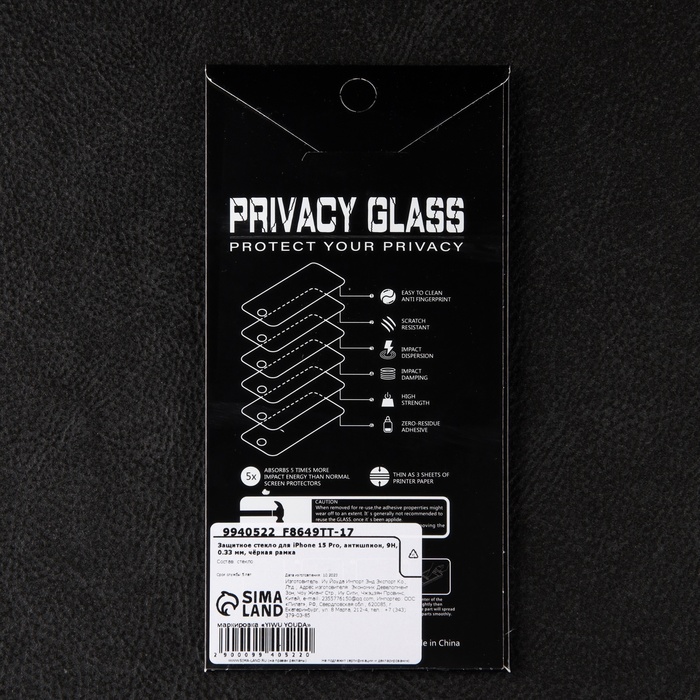 Защитное стекло для iPhone 15 Pro, антишпион, 9H, 0.33 мм, чёрная рамка — Характеристики