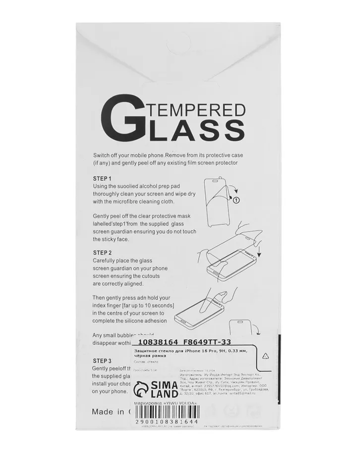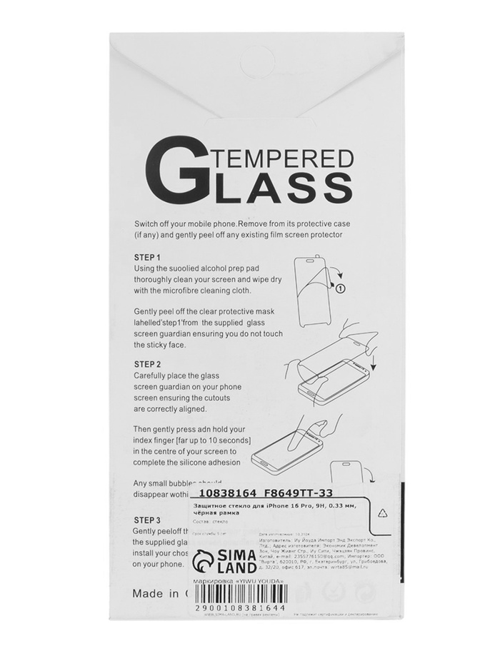 Защитное стекло для iPhone 16 Pro, 9H, 0.33 мм, чёрная рамка — Характеристики